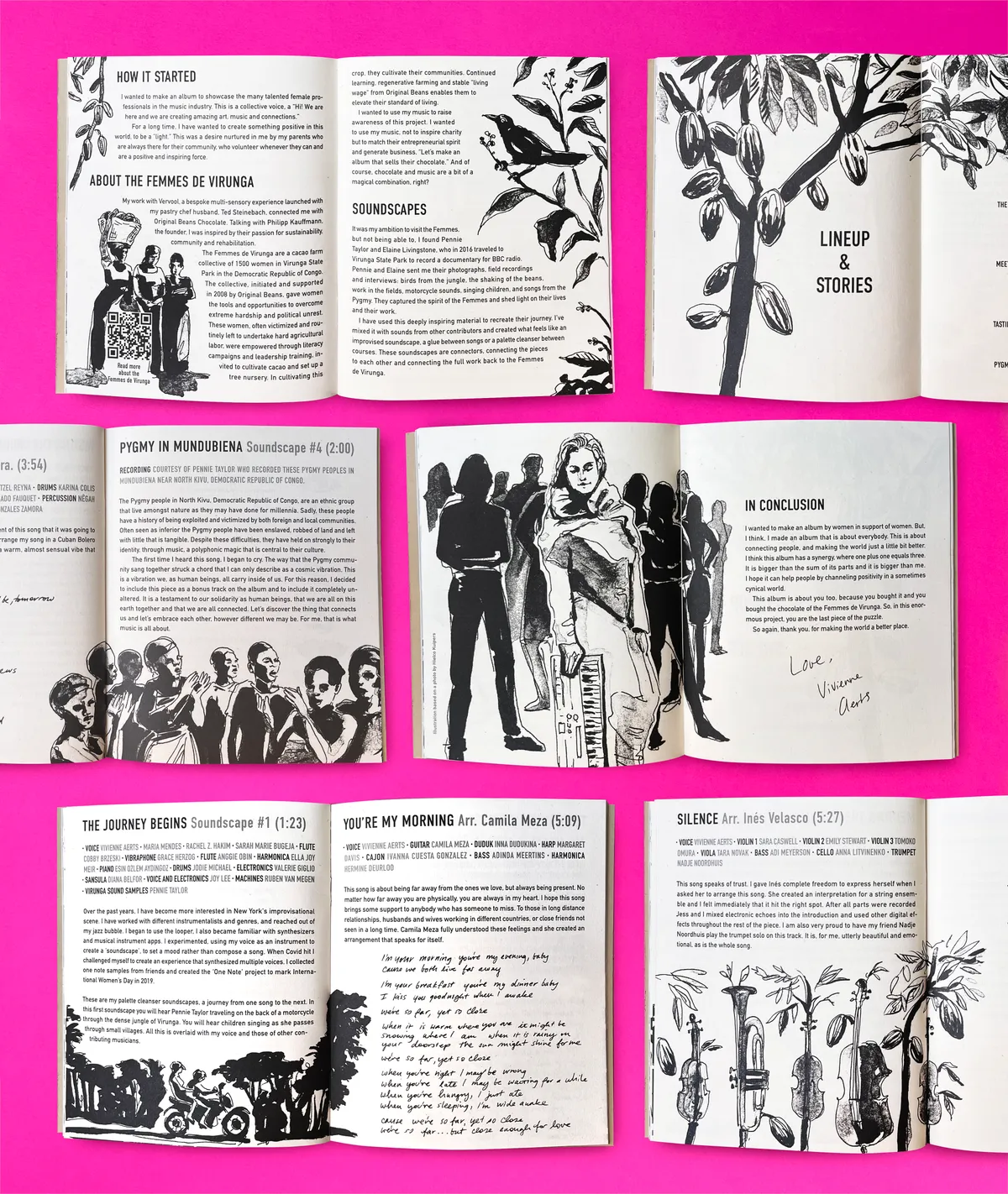 Bij die ervaring hoort ook een boekje. Een van mijn beste vriendinnen, Natalia Olbinski, is boekontwerper. Voor haar werk maakt ze blokdesigns en lay-outs. Zij kon mijn cd-hoesje ontwerpen, maar dan ben je er nog niet, want er zit heel veel informatie in die je moet vertellen en dus illustreren. Zij is gaan ontwerpen: violen waar cacaobomen uit groeien, een projectdeelneemster die cacaobonen aan het schudden is, een illustratie gebaseerd op een foto van mij uit het Leidsch Dagblad… We besloten bij de eerste vijfhonderd exemplaren een omslag van cacaopapier te doen. We hebben eerst leren zeefdrukken en daarna hebben we die allemaal met de hand gedaan.