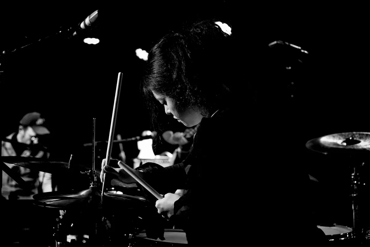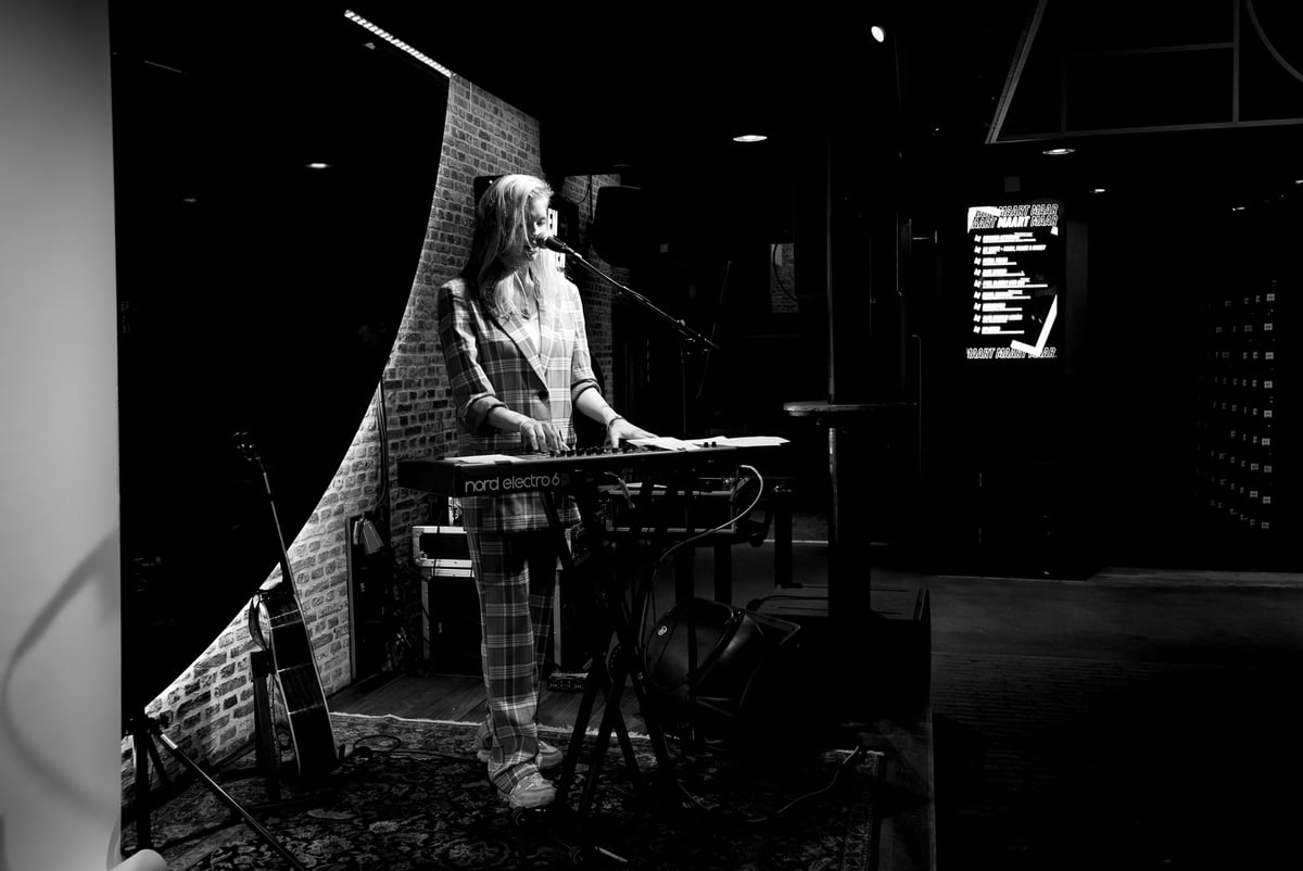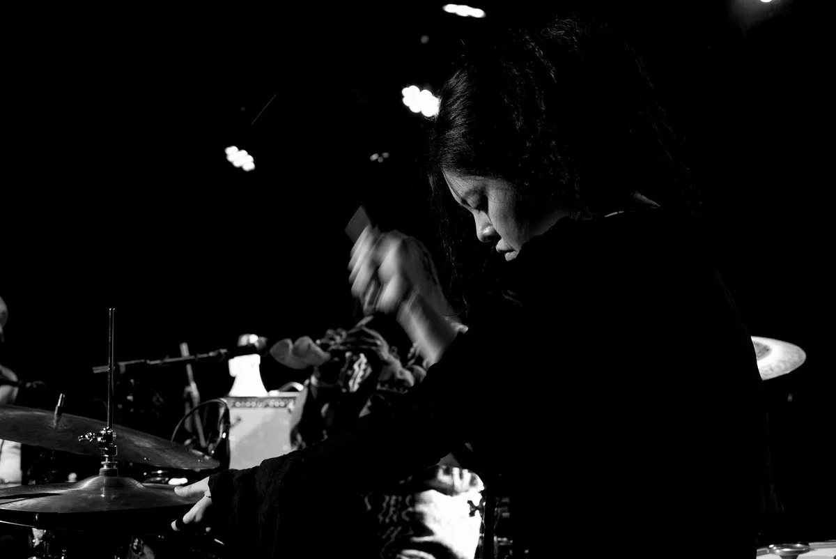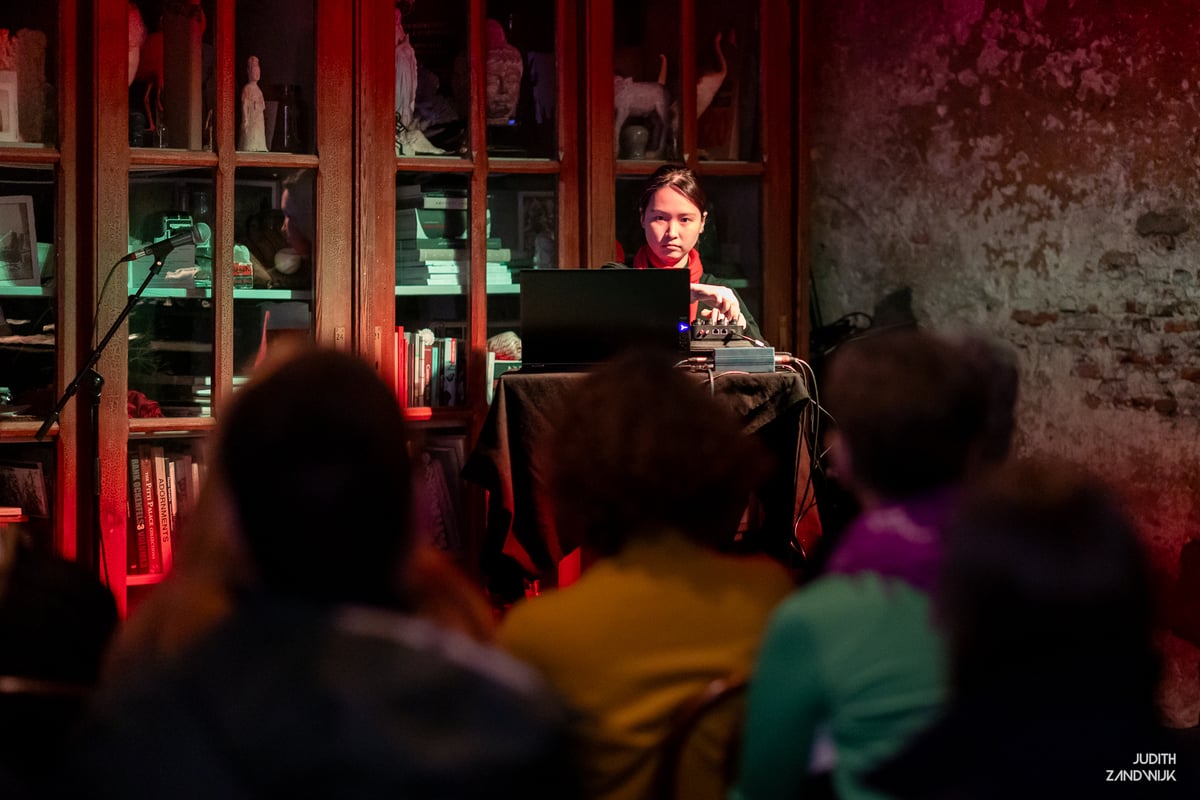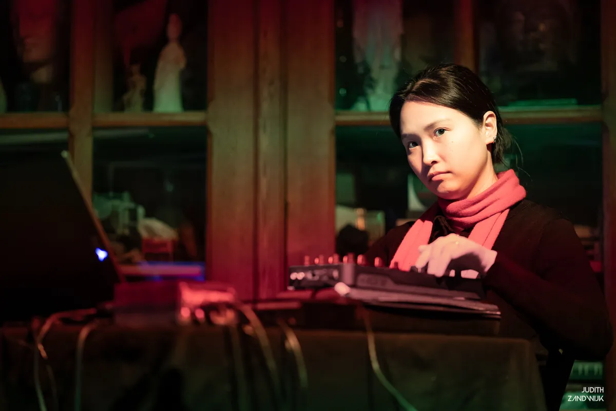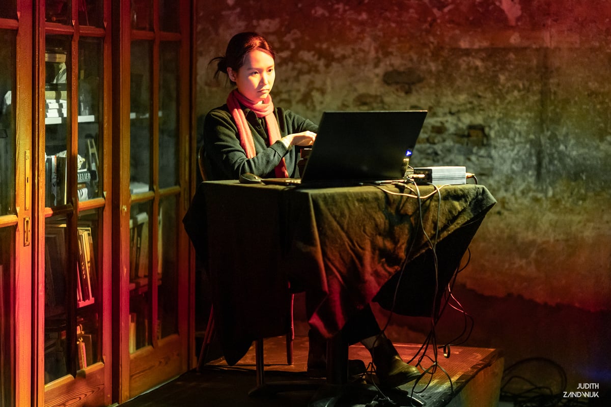 Voor haar optreden zit ambientkunstenares Minji Kim stil en bescheiden in het publiek. Zachtjes staat ze op en neemt plaats achter een laptop en een mengpaneel. Tijdens de voorstelling zal ze aan knoppen draaien, af en toe ondoorgrondelijk de zaal in kijkend.