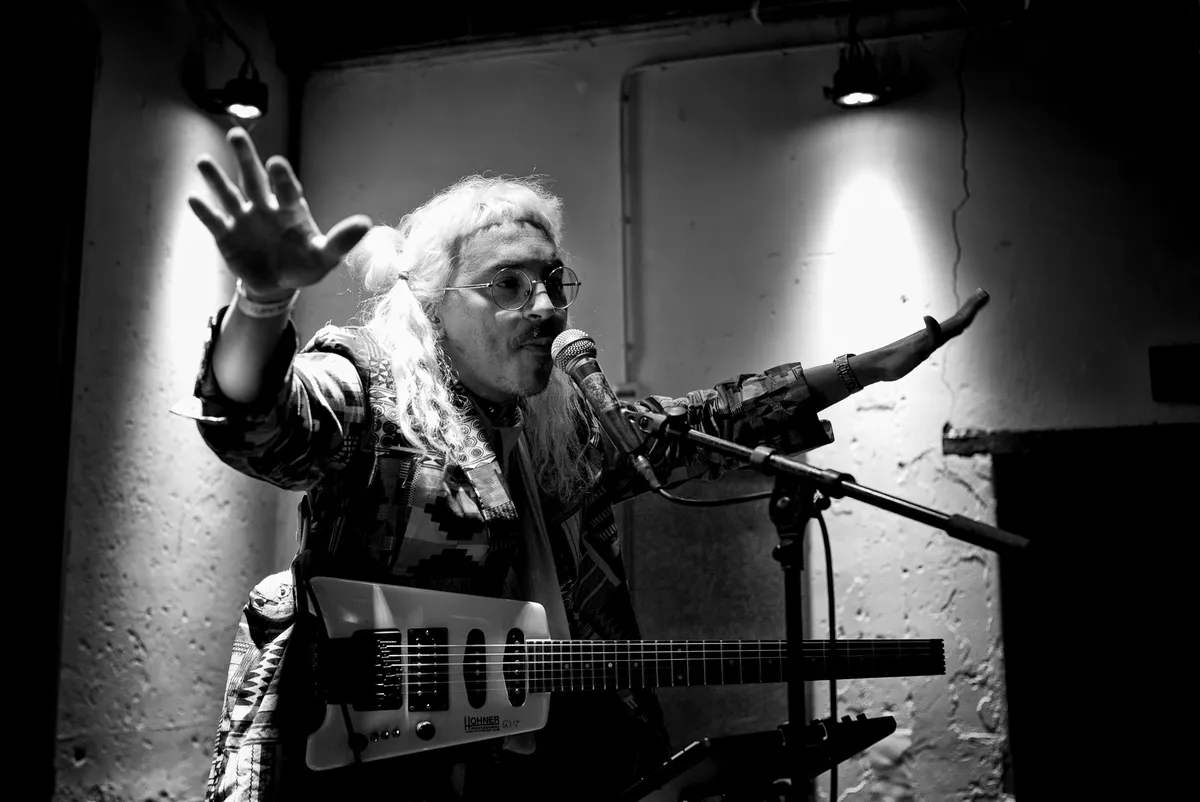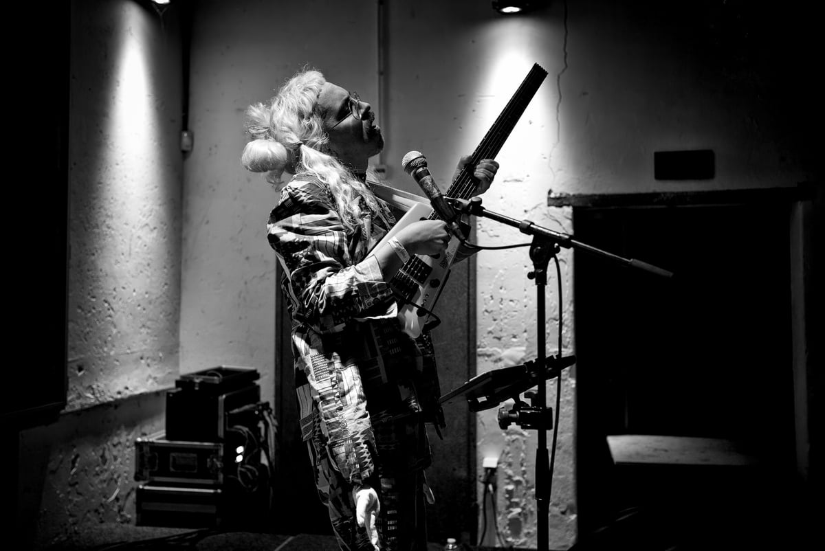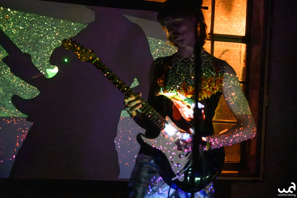 Zijn persfoto toont Julián Mayorga als een vierarmige man in felle kleding – die moeten we zien! Deze vierarmige heeft lichtblond haar in twee knotjes met daaronder een snor en een veelruitig rood pak. Zijn instrumenten zijn een kamloze gitaar, een laptop en een draadloos verbonden tablet. Hij haalt er noisy distortion, groovy beats en een looper uit. Het dansen vooraan op twee simultane ritmes en vervreemdende disharmonische klanken uit Julians gitaar wordt steeds wilder, abstracter. Daarmee past het in de cumbiatraditie uit diens geboorteland Colombia.