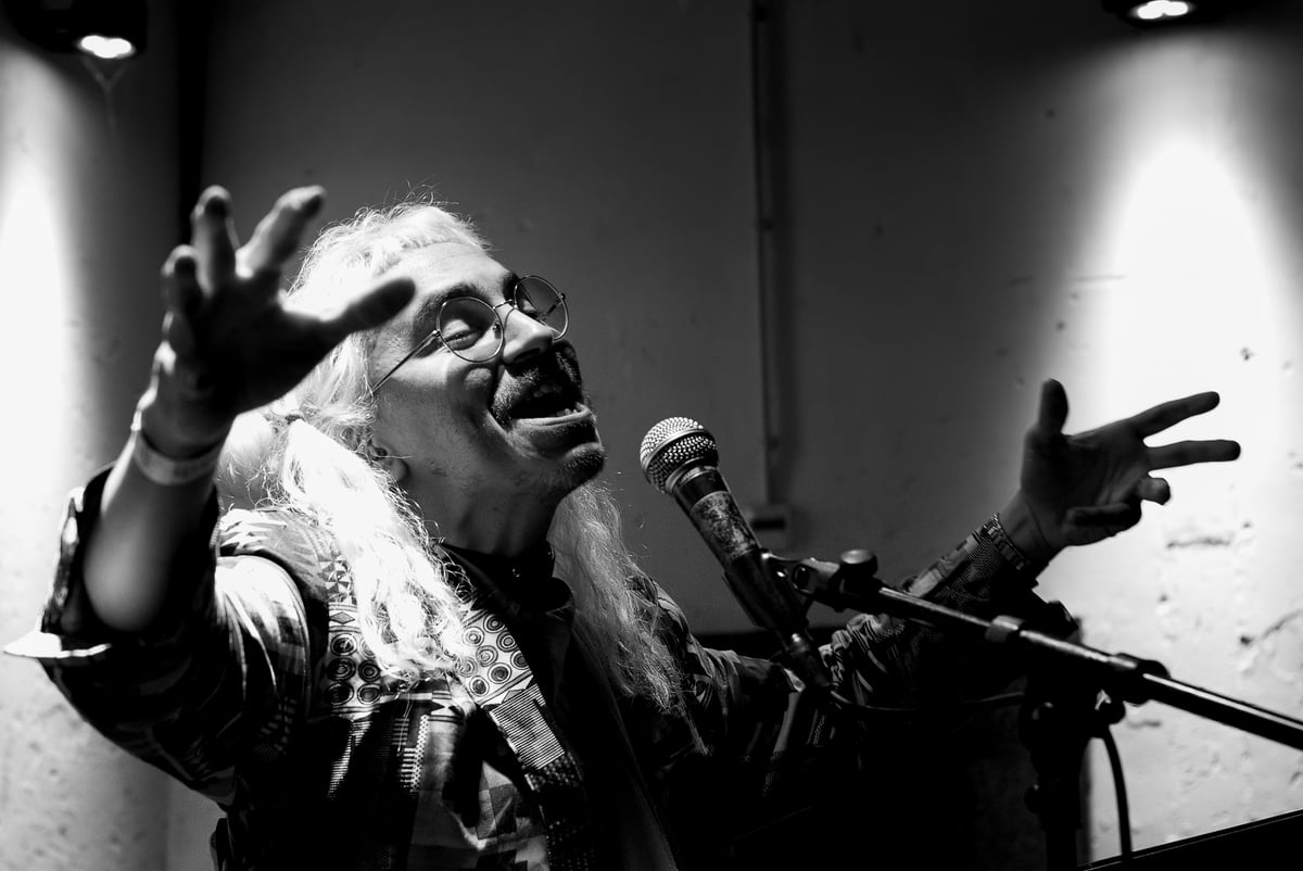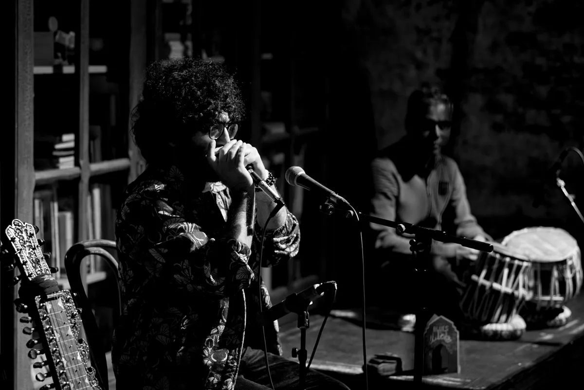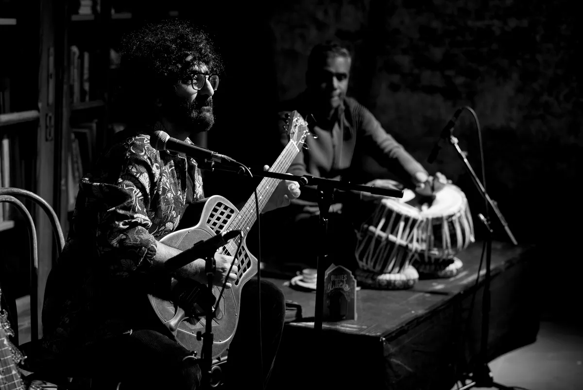Op de mondharmonica speelt hij ritmische Iraanse folk. Het is een conplentatief nummer van melancholisch verlangen, met zang in het Farsi. Dan pakt hij zijn slide guitar en laat die met zijn slide bluesy janken. Er vormt zich call and response tussen de om elkaar heen dansende gitaar en de tabla-handdrums van Suresh Sardjoe. Hamids fingerstyle aanslag is echter onmiskenbaar Iraans, de speltechniek van beiden superieur. Het stormachtige applaus na elk nummer is dan ook verdiend. De enige echt vrolijke compositie, ‘Het regent, het regent’, blijkt Sacksioniachtige blues, maar dan dus op z’n Midden-Oosters.