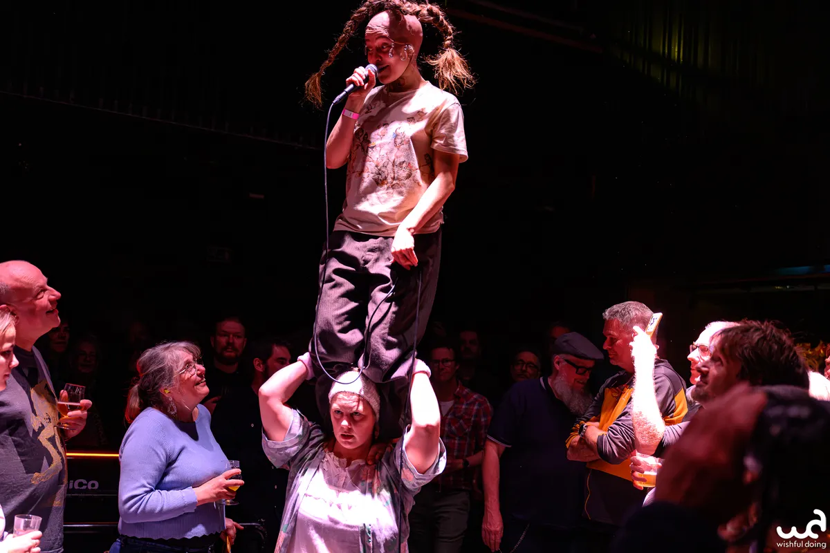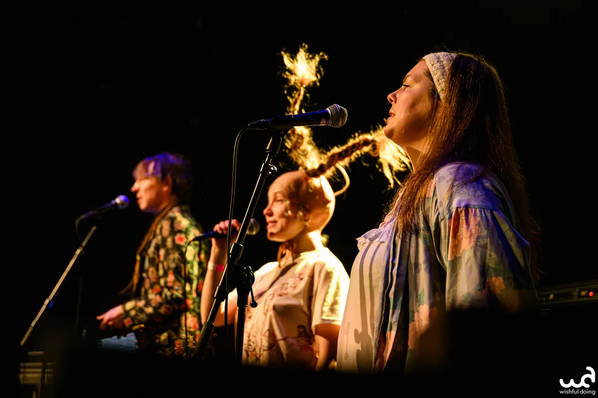 Tijdens ‘Psychoterapioa’ gaat een van de leden bij de ander op haar schouders staan, waarna ze beiden door het publiek lopen. Naast acrobatische praktijken heeft Muovipussi ook een voorliefde voor het experimenteren met ongebruikelijke instrumenten zoals ballonnen en een babypop… aan een koord… Die muziek maakt als je het rond zwaait. Midden in de set ‘sterft’ een van de leden om vervolgens terug te komen als black metal zangeres. Al gruntend gaat zij verder, terwijl haar twee metgezellen vrolijk zingend over het podium huppelen. Ja, dit is precies het goede spul waarvoor je naar Peel Slowly gaat. Ver-ruk-ke-lijk.