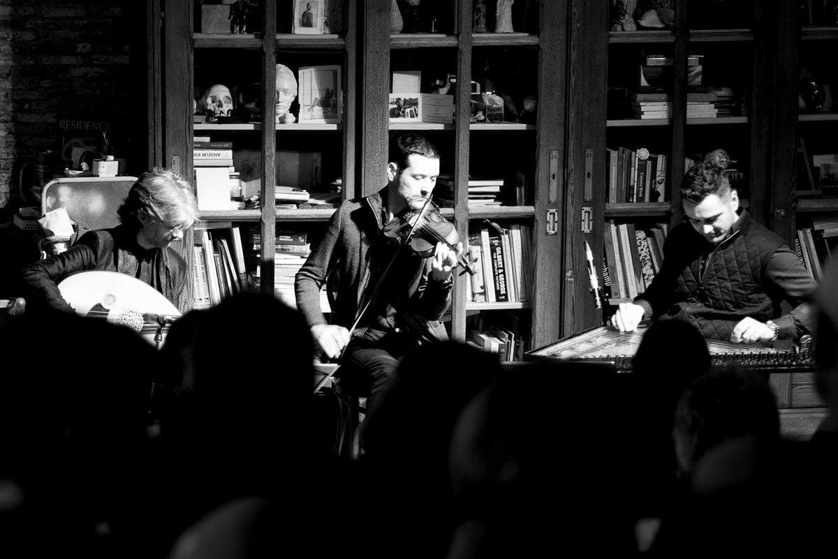 Met de aansluitende en overlappende concerten op PSAS is het soms best een logistieke uitdaging om alles kunnen te zien wat je wilt. Dus snel een sprintje getrokken en aangekomen bij M10 blijkt dit zaaltje al stampend vol voor het optreden van de Cypriotische violist Michalis Kouloumis en het Tristan Driessens Duo. Dat duo bestaat naast de Belgische oed-speler Tristan Driessens zelf uit de Turkse kanun-speler Serkan Halili. Met opperste concentratie zitten de drie muzikanten te spelen. Zij vullen M10 met een prachtige mix van eigen composities in Ottomaanse stijl en folkloristische muziek uit Cyprus en Anatolië. Het samenspel van uitsluitend de drie snaarinstrumenten is een moment van verstilling en rust in de dynamische snelkookpan die Peel Slowly And See toch ook is. En ook hier worden we geraakt door muzikale ontdekkingen en indrukwekkend vakmanschap. Vooral Kouloumis maakt indruk met zijn razendsnelle, vingervlugge vioolspel. Daarnaast is het verrassend hoe harmonieus het repertoire, ondanks het gebruik van microtonale, Ottomaanse toonladders, in de oren van ongeoefende luisteraars klinkt. (CB)