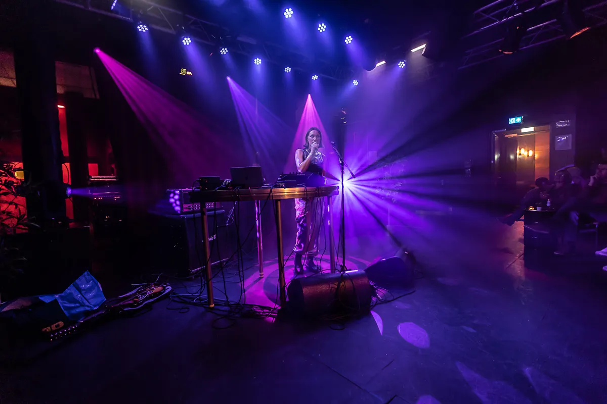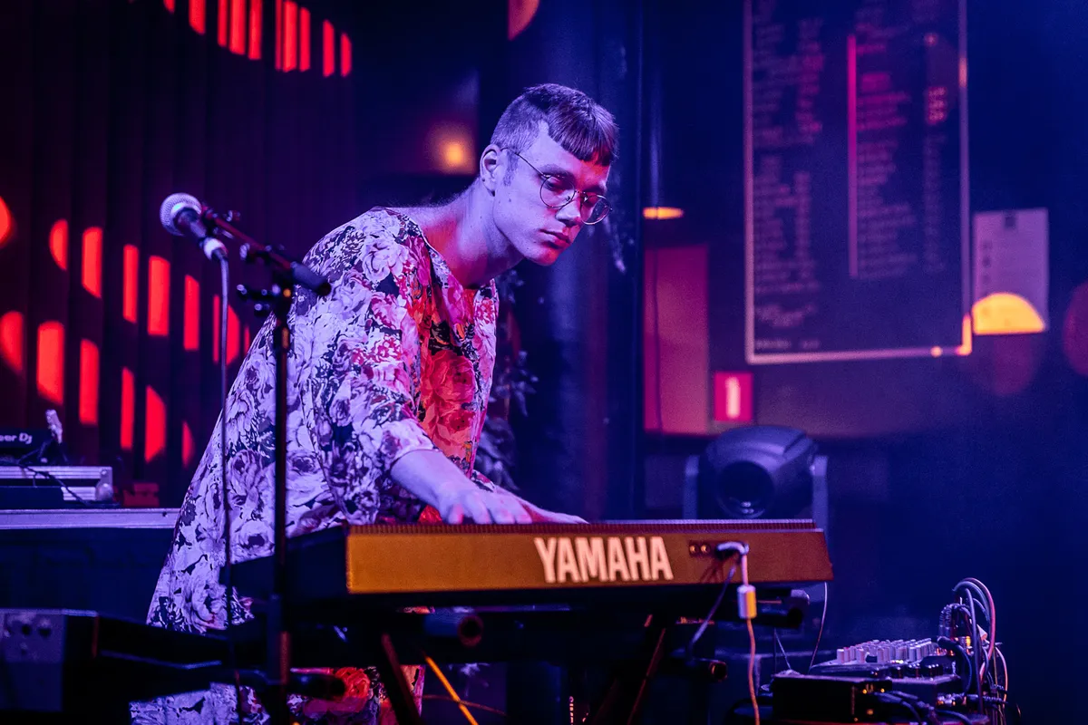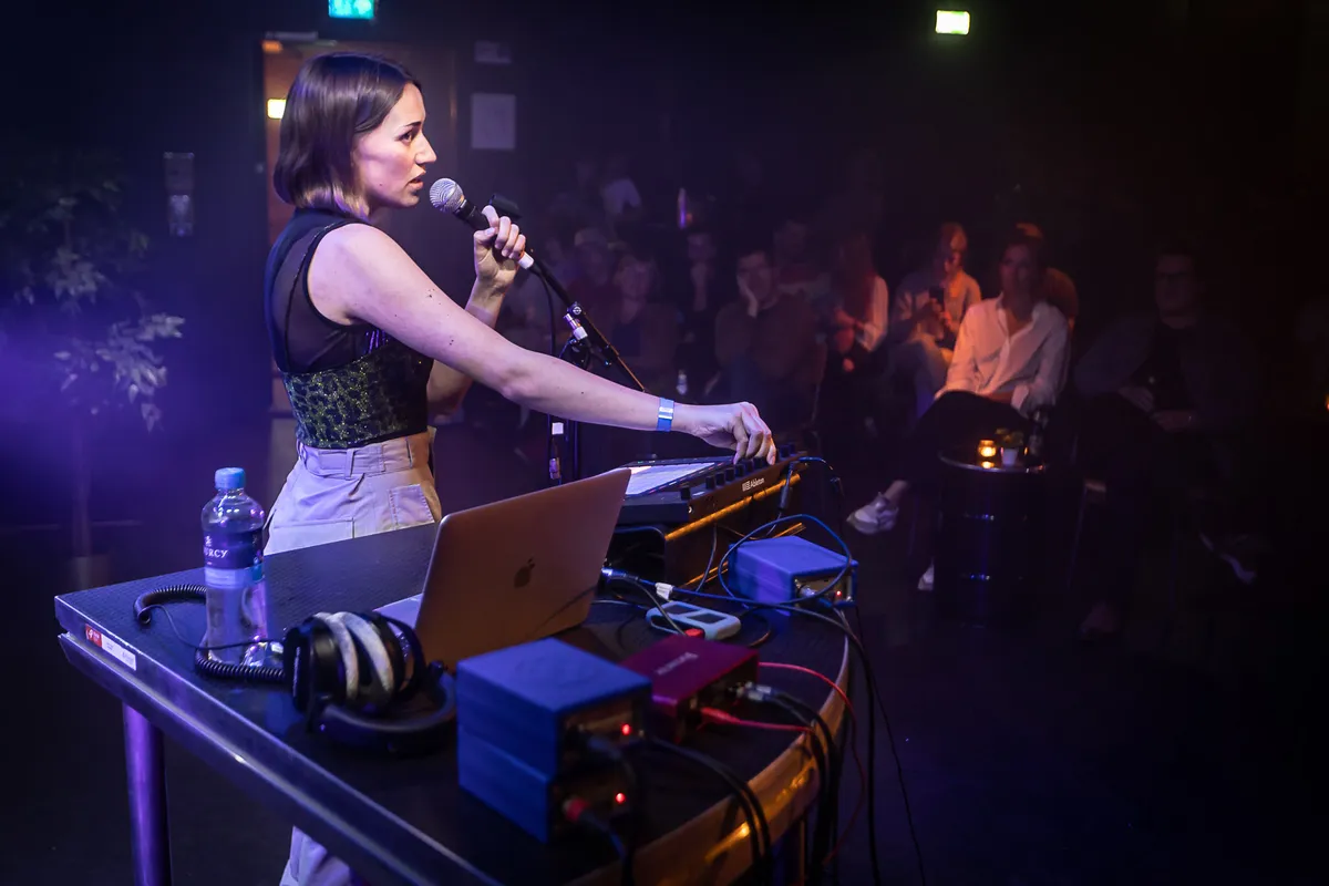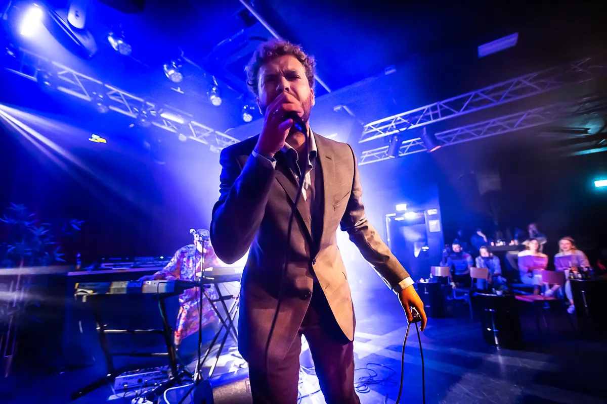 Een biertje later is het tijd voor heel wat anders. In de trant van Doe Maar geeft de schrijver van Nederlandstalig popliedjes Huub Prins een vermakelijk, maar wat vlak optreden. Met teksten als: “Als je alles weer vergeet, heeft het dan überhaupt zin om bij de les te blijven?” neemt hij het publiek mee in een coole jaren tachtig vibe. Zonder podiumangst danst hij sierlijk heen en weer, trekt hij zijn bloesje uit en speelt hij tijdens het zingen met de mensen in de zaal, die er enthousiast op reageren. Ook hij bedient tijdens het zingen een sampler. Af en toe klinkt er iets moois in de muziek, zoals een mondharmonica. Maar de zang is, zeker tijdens zijn geschreeuw, soms slecht te verstaan en na het zoveelste nummer slaat de eentonigheid toe. Ook als een collega zich bij hem op het podium voegt om een paar liedjes mee te zingen. Het muzikale repertoire dat verscheen op zijn albums Buitenspelen en De Rat is aanzienlijk, maar de show in Simplon mist melodie en balans. Met wat meer humor, pit en een vrolijker timbre zouden Prins’ liedjes meer in hun element zijn.
