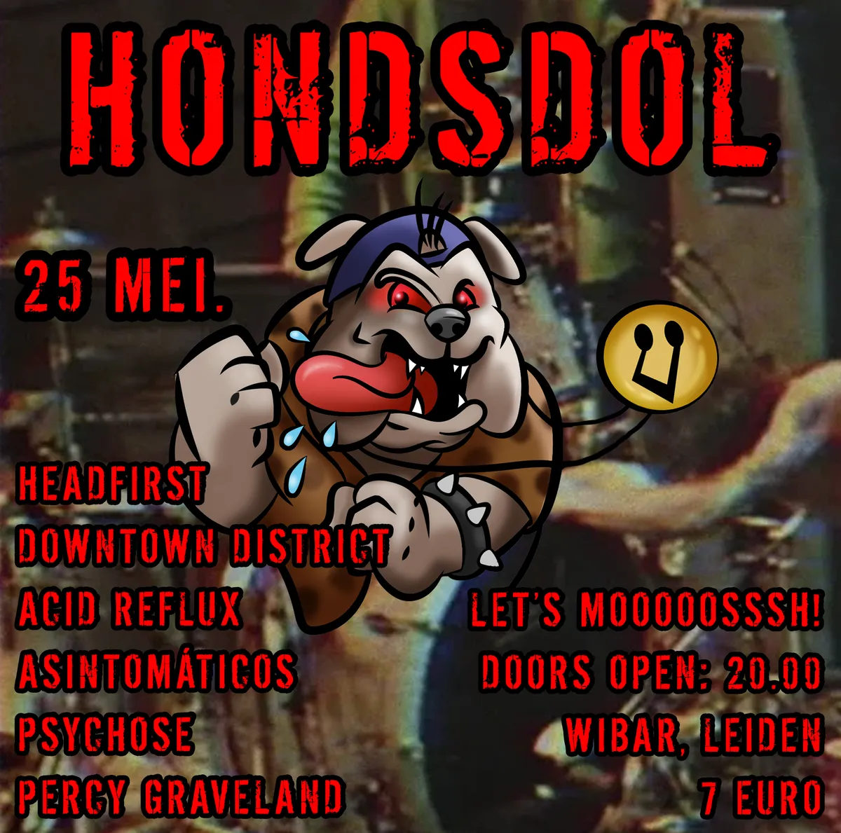 Hondsdol is een stichting met drie doelen: talentontwikkeling van jonge ambitieuze artiesten, ondersteuning van creatieve broedplaatsen en vrijhavens, en een boost van de music scene. Daarom organiseren ze tot aan de zomer zo'n twintig concerten, vooral in de Randstad, en dus ook een in Leiden. In de Wibar spelen zes bands - vier Leidse: Acid Reflux (alternative rock), Asintomáticos (punk), Downtown District (punk), Headfirst (punky rock), en twee gasten: Percy Graveland (alternative rock) uit Alkmaar en Psychose (punk hiphop) uit Almere.