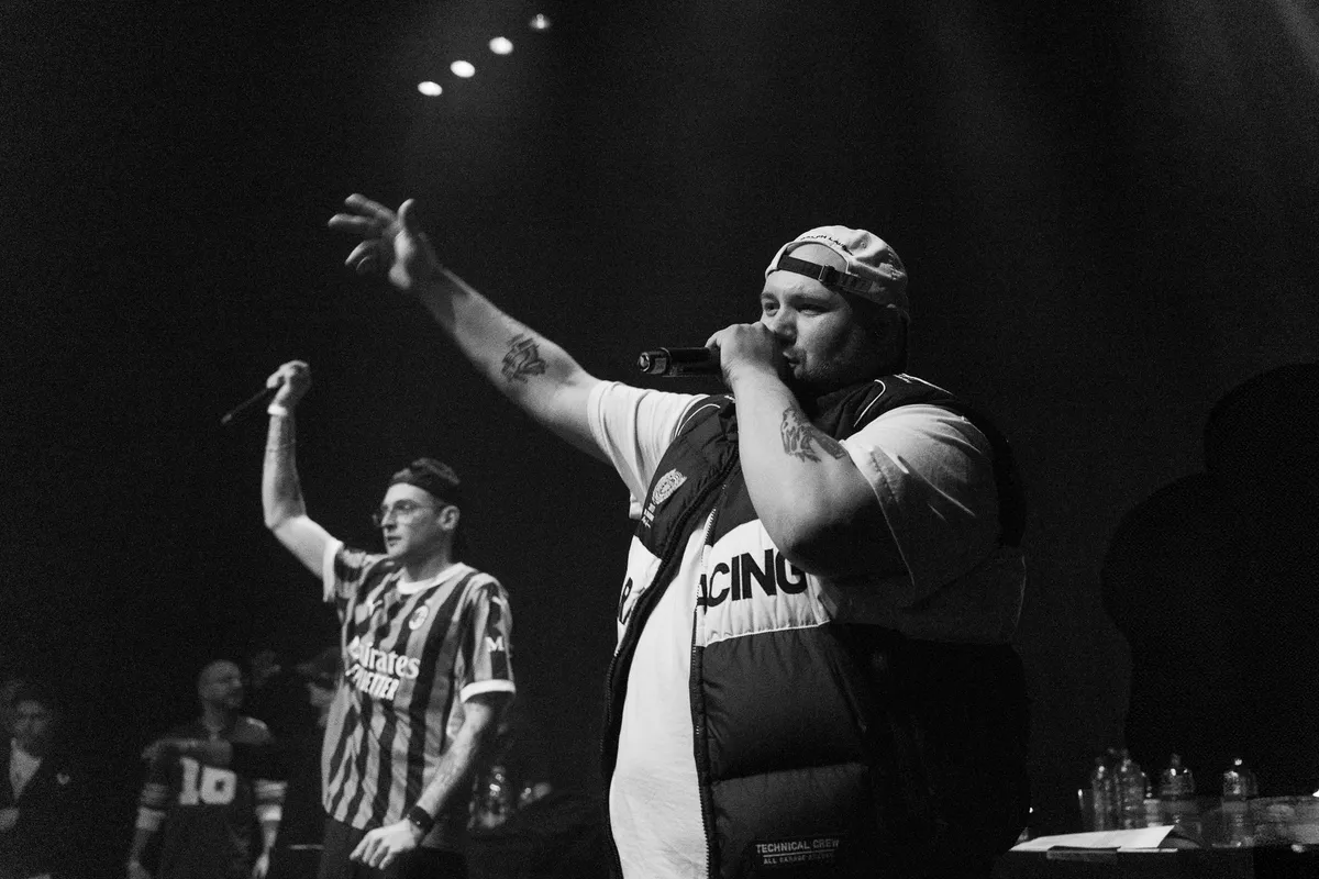 Als Rafting Goods het podium opkomt, lijkt de zaal in beweging te komen. De groep gooit direct de energie omhoog met 'FRITUUR OP 180'. Het publiek reageert uitbundig, de eerste rijen gaan los. De leden wisselen elkaar soepel af, ad-libs vliegen over en weer. Dit is geen geregisseerde show, maar een spontane hiphopsessie waarin interactie vooropstaat. Niet alleen de mannen laten van zich horen. Nina en Ella John zorgen voor een van de meest indrukwekkende momenten. Wanneer ze het vrouwelijke deel van het publiek oproepen om zich te laten horen, klinkt een krachtige respons uit de zaal.