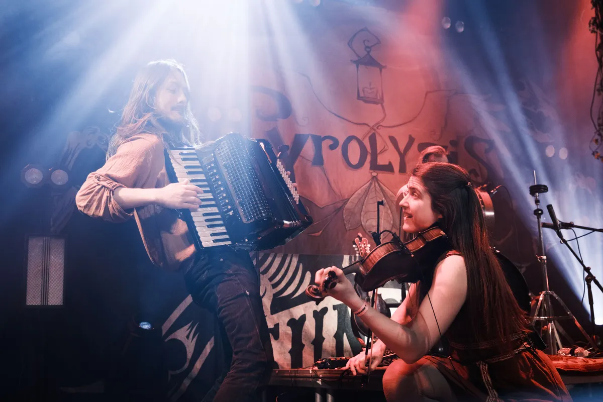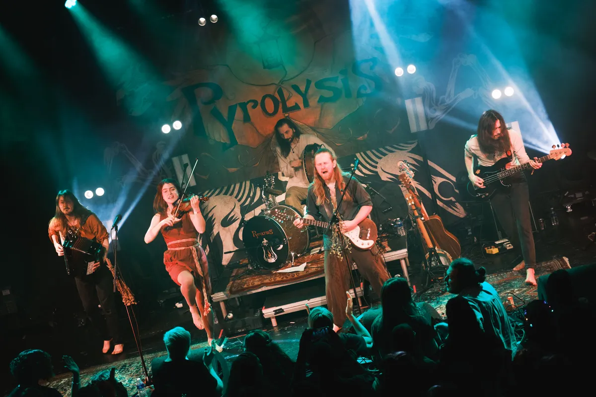 Na een pauze van twintig minuten wordt een belofte ingelost: ons waren blote voeten beloofd en die krijgen we als Pyrolysis het podium opkomt. Blootvoets, met wat simpele gedroogde bloemen aan de microfoonstandaards en de feeërieke bandbanner op de achtergrond, verandert de sfeer naar die van een Ierse pub. Naast de viool is er nu ook een accordeon op het podium, wat, samen met de rook en de diepe leadstem, de sfeer van de mythische folkband compleet maakt.