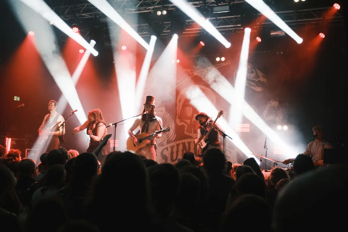 Dat Sunfire wel moet spelen deze avond, wordt duidelijk als de band het podium onder luid applaus betreedt. In één keer verandert de setting van De Helling van een Keltische pub naar een Wild West Saloon. Met een banjo, hoge hoed, bretels en een likje oogschaduw lijkt de band zo uit de videogame ‘Red Dead Redemption’ te komen: ruw, ruig en rauw. Het is dan wel drie maanden terug dat de band heeft opgetreden - af en toe moet er even afgestemd worden - het publiek maakt het niets uit en ze gaan helemaal mee in de wereld van paarden, whisky en gouden dukaten.