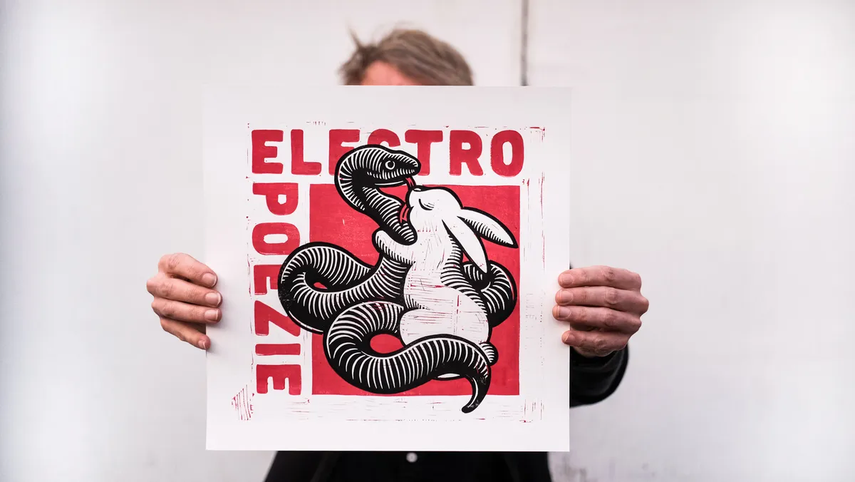 De poster voor de eerste labelavond wordt vol trots gepresenteerd. Anne Caesar, die er ook een aantal jaren kunstacademie op heeft zitten, heeft in een beperkte oplage linosnedes gemaakt in de ruimte twee muren verderop. ‘Deze is net uitgekomen toen het luchtalarm afging. Op de eerste maandag van de maand, net als de single van Eva. Dat gaan we met alle releases doen, of dat nou een single, een album of een kunstwerk is. Elke eerste maandag van de maand moeten mensen voelen dat er iets van Zeevonk uitkomt.’