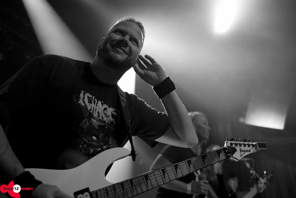 Maar zelfs die worden in het gareel getrokken tijdens de ritmische rite van 'Spiritual Poison', een track waarbij de zanger met satanische stem ons als brave sekteleden maant te klappen. Wat er ook voor entiteit is aangeroepen, hij geeft gehoor als er vervolgens een bezeten cirkel des doods ontstaat (de moshers rennen in een rondje in plaatst van kris kras door elkaar). Het zweet zit nu ook goed in de bezoekers, maar gelukkig zijn er genoeg langharigen die door wapperend kapsel tot menselijk föhnen zijn verworden. Wat valt nog meer op? De bijna hossende tune van 'Great Fiery Entity', het praatje over catharsis bij in 'In Crimson Rays' (pittherapie klinkt als een gat in de markt) en nog wat extra blast beats in de finale om de overwerkte drummer te pesten. De heren hebben het onmogelijke voor elkaar gekregen, de Rubicon is doorkruist: ik ga dit daadwerkelijk in m'n playlist mikken tussen de poppunk en indie dance.