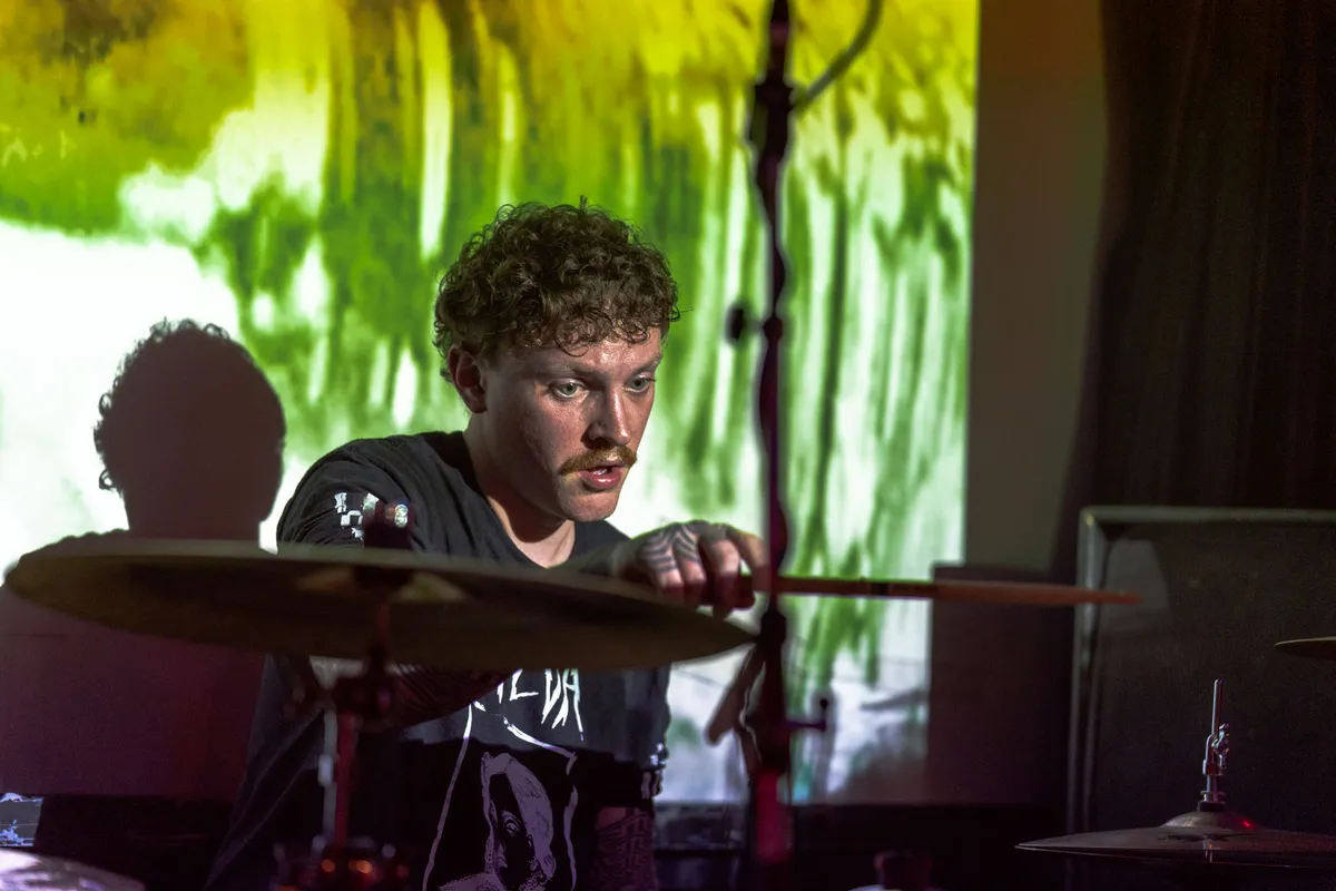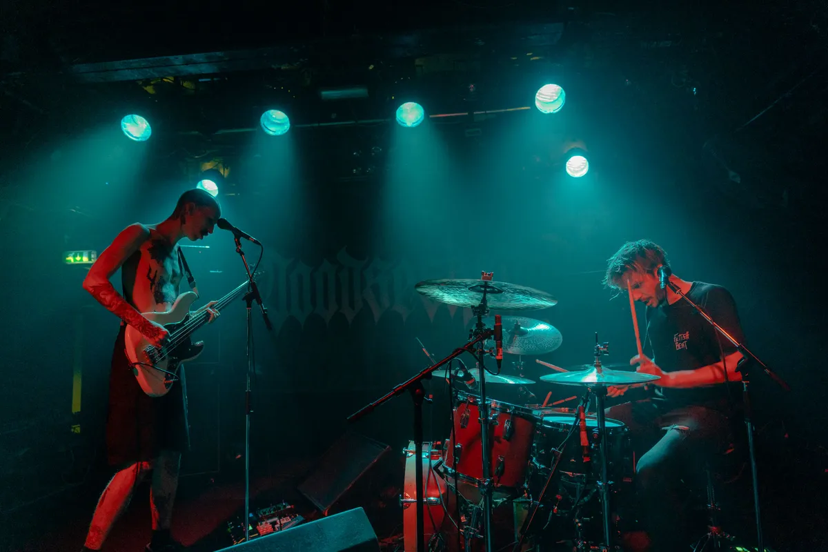 Het Belgische duo Doodseskader heeft vervolgens veel tijd nodig om op te bouwen. Alle apparatuur van dB’s zelf moet de zaal uit, een spandoek gaat omhoog, snoertje hier en snoertje daar. En er is nog niet eens gesoundcheckt. Het houdt ons in ieder geval in spanning. Wanneer het begint zet cleane zang ons eerst op het verkeerde been. Vervolgens bouwen ze echter met enkel basgitaar, drums en screams een logge muur van lawaai waar bands als KARP of The Body nog jaloers op zouden worden. Noem het noiserock, noem het sludge, of desnoods doommetal. Heel de zaal dreunt mee en je kleding wappert. Lekker!