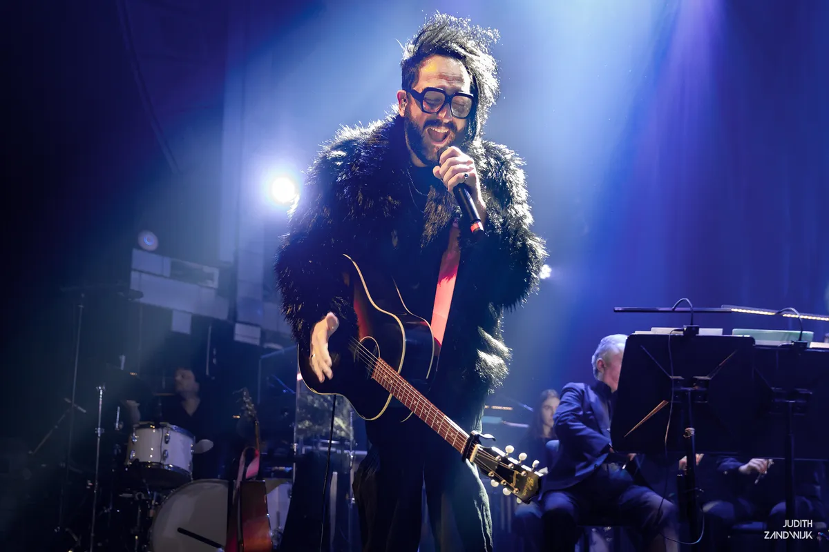 De spanning wordt meteen gebroken met een opvallend luchtige PowerPointpresentatie van NPO Klassiek presentator Sander Zwiep. Geen droge introductie, maar humor, weetjes en een paar zelfrelativerende knipogen naar Johannes Sigmund, dirigent Joost Gevers en arrangeur Marijn van Prooijen. De zaal lacht en heeft er nu echt zin in. Wanneer het orkest vervolgens inzet met het intro van ‘Lonely city exit wounds’, verschijnt Johannes Sigmund pas halverwege het orkestrale opbouwmoment op het podium, gehuld in een bontjas die meer popster dan singer-songwriter ademt. Zodra hij inzet, valt vooral op hoe trefzeker zijn kenmerkende stemgeluid live klinkt: direct raak.