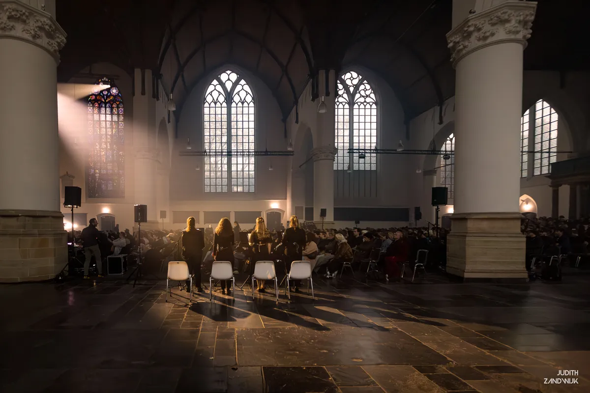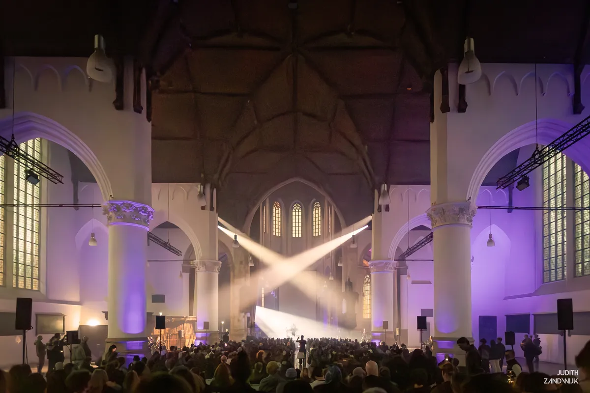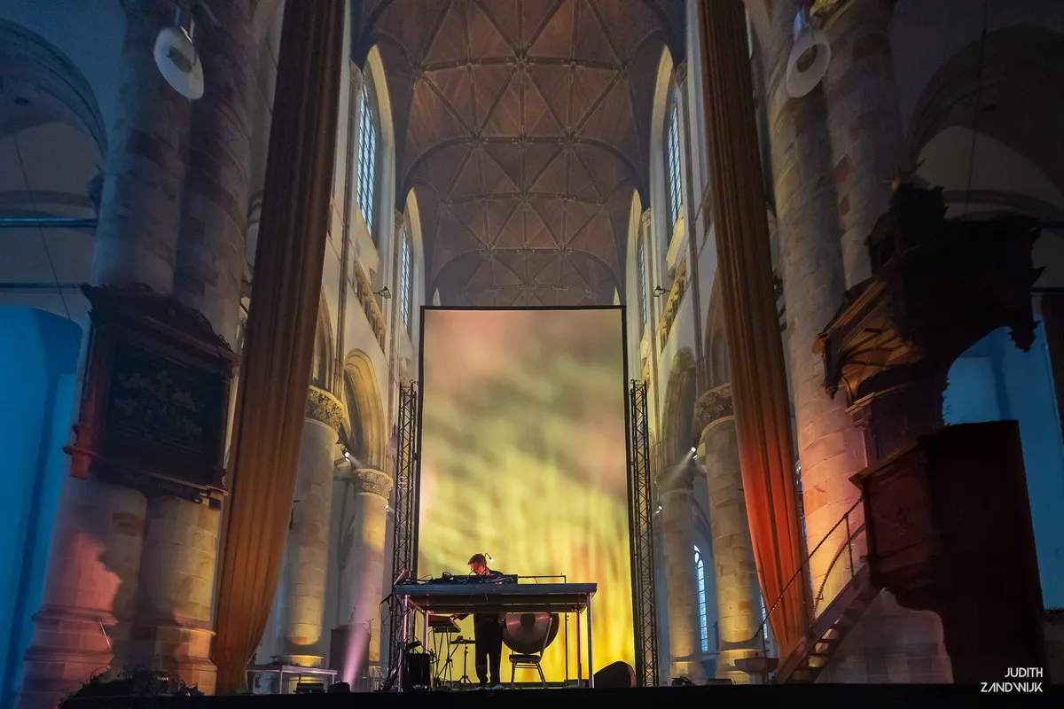 De Grote Kerk is een bijzondere locatie, die traditioneel wordt voorbehouden aan bijzondere acts: zo vertolkte Xiu Xiu in 2016 de iconische soundtrack van cultserie Twin Peaks. Vanavond voert Moritz von Oswald Silencio op met The Hague Vocal Ensemble. De kerk voelt aan als de enige geschikte locatie voor deze show. Van de manier waarop Von Oswald door de mist met wandelstok het podium opkomt, tot aan de bezwerende armbewegingen van dirigente Angeliki Ploka en het metershoge projectiescherm naast het spreekgestoelte. Het heeft allemaal iets cultisch. Synthetische en menselijke stemmen golven etherisch en dissonant door de hoge ruimte. Het geklap tussen de nummers door haalt de vaart eruit. Dit muziekstuk wil je het liefste onafgebroken ervaren. Zelfs het tijdslot is goed gekozen, zo schijnt de zon door de glas-in-loodramen en zorgt voor extra immersie.