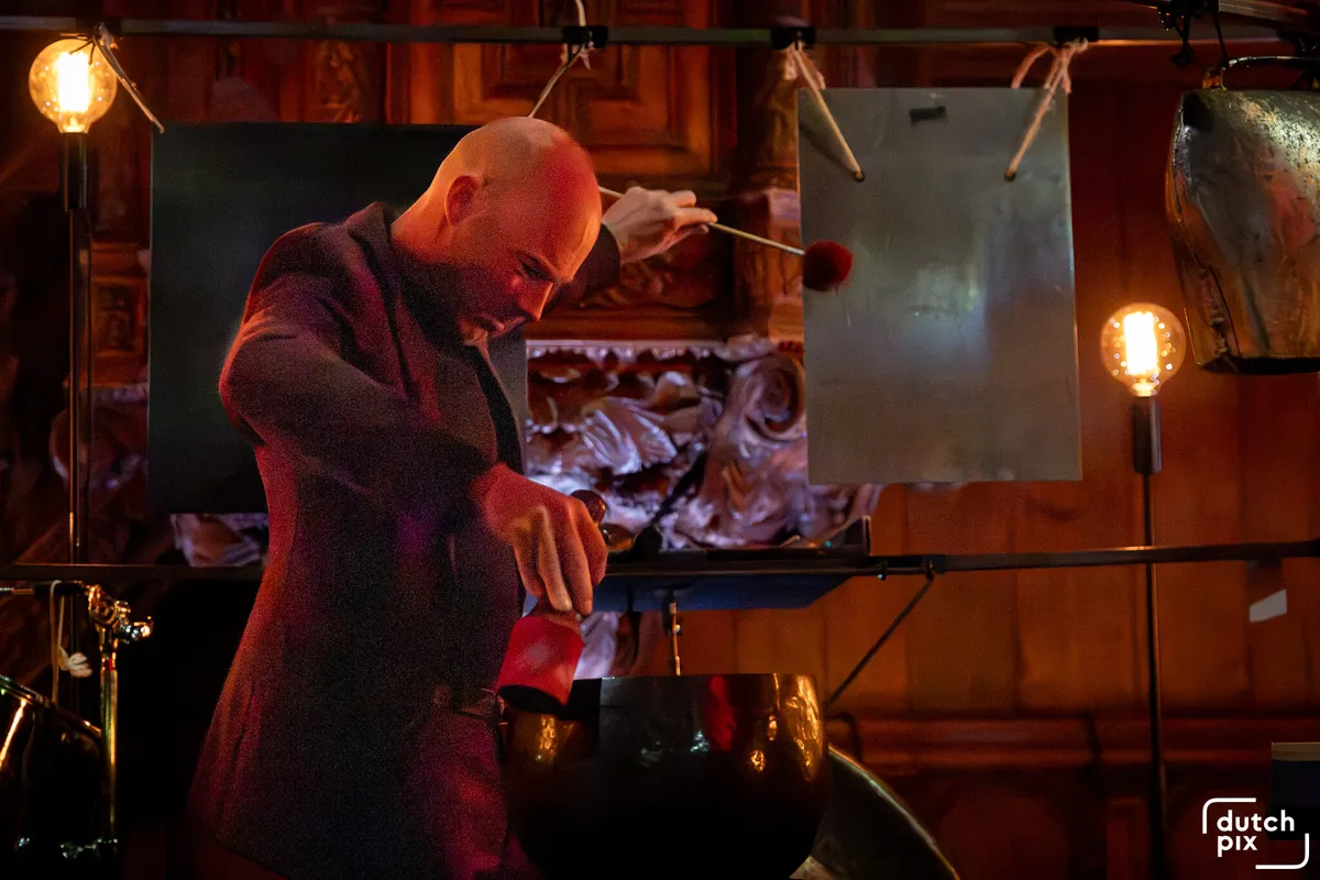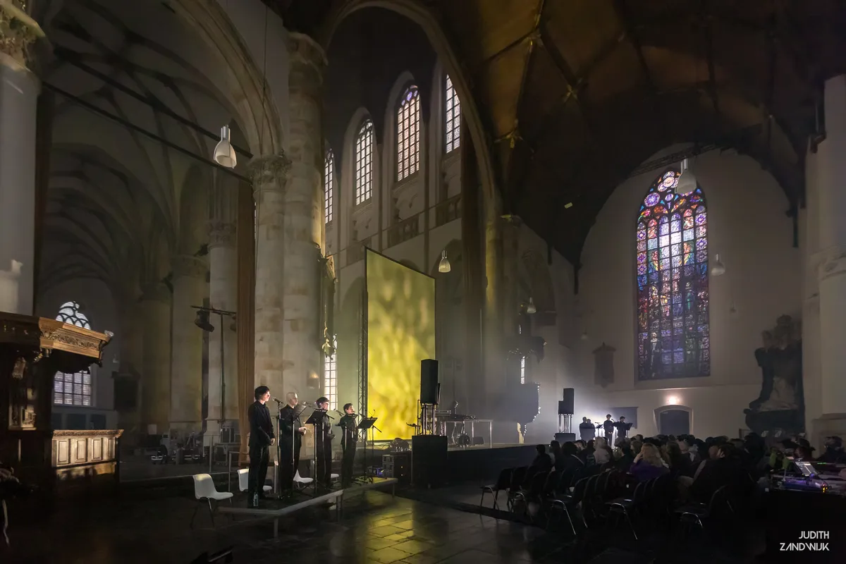 Op een van die prachtige locaties opent het Haagse Ensemble Klang vrijdagavond. Het is een bijzondere avond voor het Ensemble, want ze spelen in de Nieuwe Kerk een stuk van de onlangs overleden Éliane Radigue. Radigue schreef dit stuk speciaal voor het Ensemble. ‘OCCAM DELTA XXIII’ wordt uitgevoerd door een deel van het Ensemble: Daan van Koppen (saxofoon), Anton van Houten (trombone) en Joey Marijs (percussie). Saxofoon en trombone zitten tegenover elkaar en zwellen langzaam aan, als nachtelijke golven, waarbij de rond het podium neergezette lampen als sterren dienst kunnen doen. De golven zwellen aan en sterven weer langzaam weg. Het ensemble laat het publiek ademloos achter.
