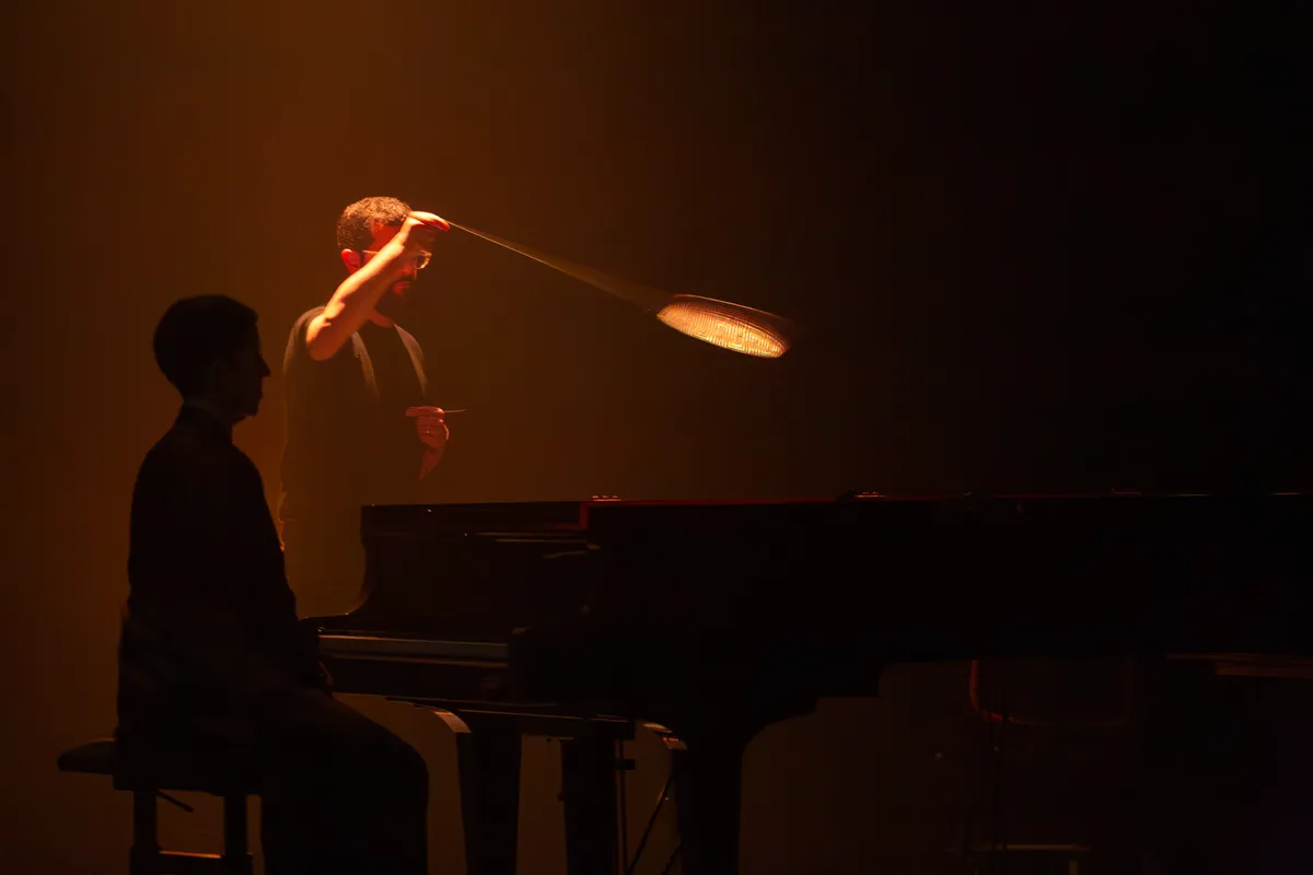 Het eerste wat opvalt is dat de pianist op links, die het eerste stuk alleen uitvoert, de pianosnaren met de hand en allerlei objecten beroert, afgewisseld met losse noten, wat een bevreemdend effect geeft. Het zou een soundtrack van een horrorfilm kunnen zijn. Dat wordt nog eens benadrukt doordat sommige geluiden pijn doen aan het tandglazuur. Wij vermoeden dat de artiest met iets over een hoge snaar heen schraapt, wat klinkt alsof iemand met zijn nagels over een schoolbord krast. De persoon in de zaal die tijdens het stuk keihard zijn neus snuit, is een komische onderbreking. Na afloop haalt de pianist een papiertje uit de piano. Betekent dit dat dit stuk daadwerkelijk was uitgeschreven?