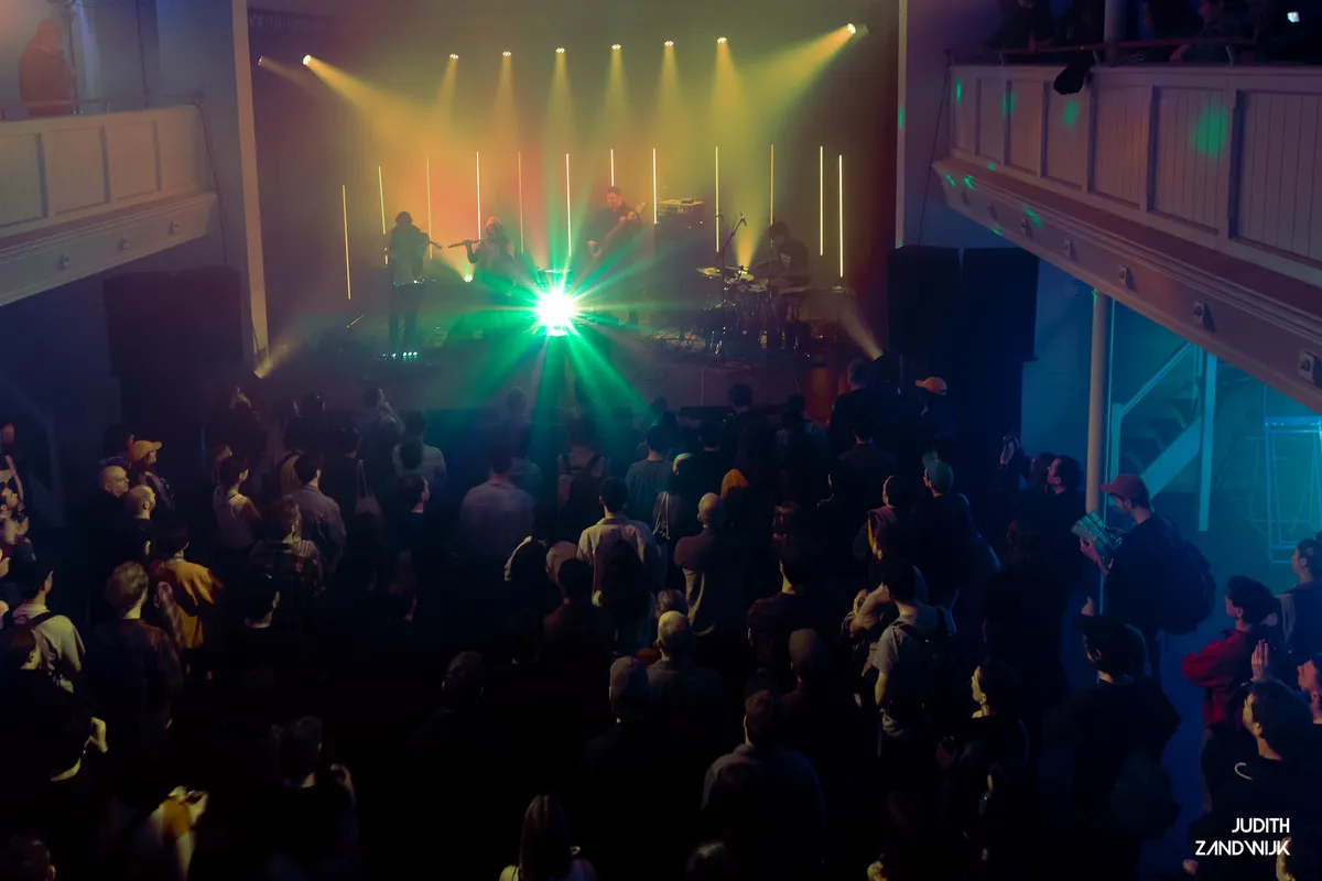 Voor het optreden van Speakers Corner Quartet reizen we af naar Concordia, en om meteen met de deur in huis te vallen: het is vanaf de eerste noot spannend. De band uit Londen bestaat sinds 2006 en fungeerde jarenlang als huisband tijdens hiphop- en spoken word-avonden, om vorig jaar debuutalbum Further Out Than the Edge uit te brengen. In Concordia worden dreigende klanken langzaam aangevuld met een hoopvolle melodie op de dwarsfluit, viool en tribale drums. Het viertal vertelt tijdens het eerste stuk, dat een minuut of twintig in beslag neemt, een verhaal door te spelen met ritme, melodie en dynamiek. En dat zonder teksten. Een lamp die om de haverklap van kleur verschiet, midden op het podium, maakt het geheel af. Na welverdiend applaus volgt een stuk dat met zijn analoge en elektronische beats uitnodigt tot bewegen zonder het avontuurlijke geluid te verliezen. Speakers Corner Quartet weet moeiteloos de aandacht van het publiek vast te houden en levert daarmee een geslaagd optreden af.
