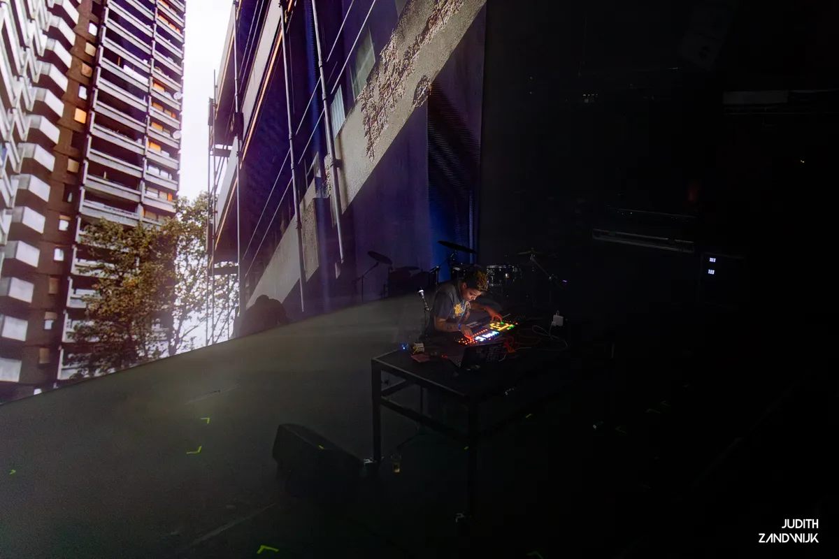 Terwijl we met een rustgevende wolk boven ons hoofd Korzo betreden, wordt duidelijk dat we hier een andere wereld binnenstappen. Het is duidelijk dat iedereen hier al aan de clubsetting is gewend. Wij nog niet. Mensen lopen, dansen en staan verspreid, en bij de bar staat een dj te draaien, los van de zalen waar vanavond muziek is geprogrammeerd. Binnen draait Nick León met Ezra Miller een aardige set, die weinig enthousiasmerend is. Alleen bij opzwepende tracks die een midden vinden tussen perreo en techno klinkt luid gejuich. Meer van dit graag! Dat blijft uit. Voor een aanjager van een nieuw clubgeluid hadden we van Nick León meer verwacht. Het is alsof hij de playlist van het festival heeft aangezet en op basis van de rustgevende artiesten een selectie heeft gemaakt voor zijn wereldpremiere van deze audiovisuele samenwerking met Ezra Miller.