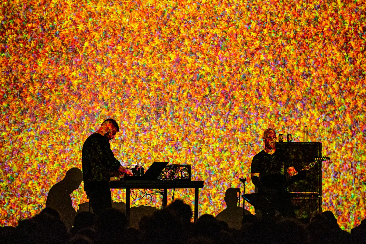 Het is altijd een slecht teken als medewerkers bij de ingang oordoppen uitdelen. Dat belooft namelijk weinig goeds voor het trommelvlies. De eerste bassen die Ben Frost uit zijn apparatuur tovert, bevestigen onze vermoedens; die voelen we. Het optreden begint rustig met wat soundscapes, maar als gitarist Greg Kubacki, bekend van mathcoreband Car Bomb, zijn gitaar heeft gestemd en een slokje van zijn bier heeft genomen, is het aan. Loodzware riffs vullen de geluiden van Frost aan om samen een overdonderend geheel te vormen.