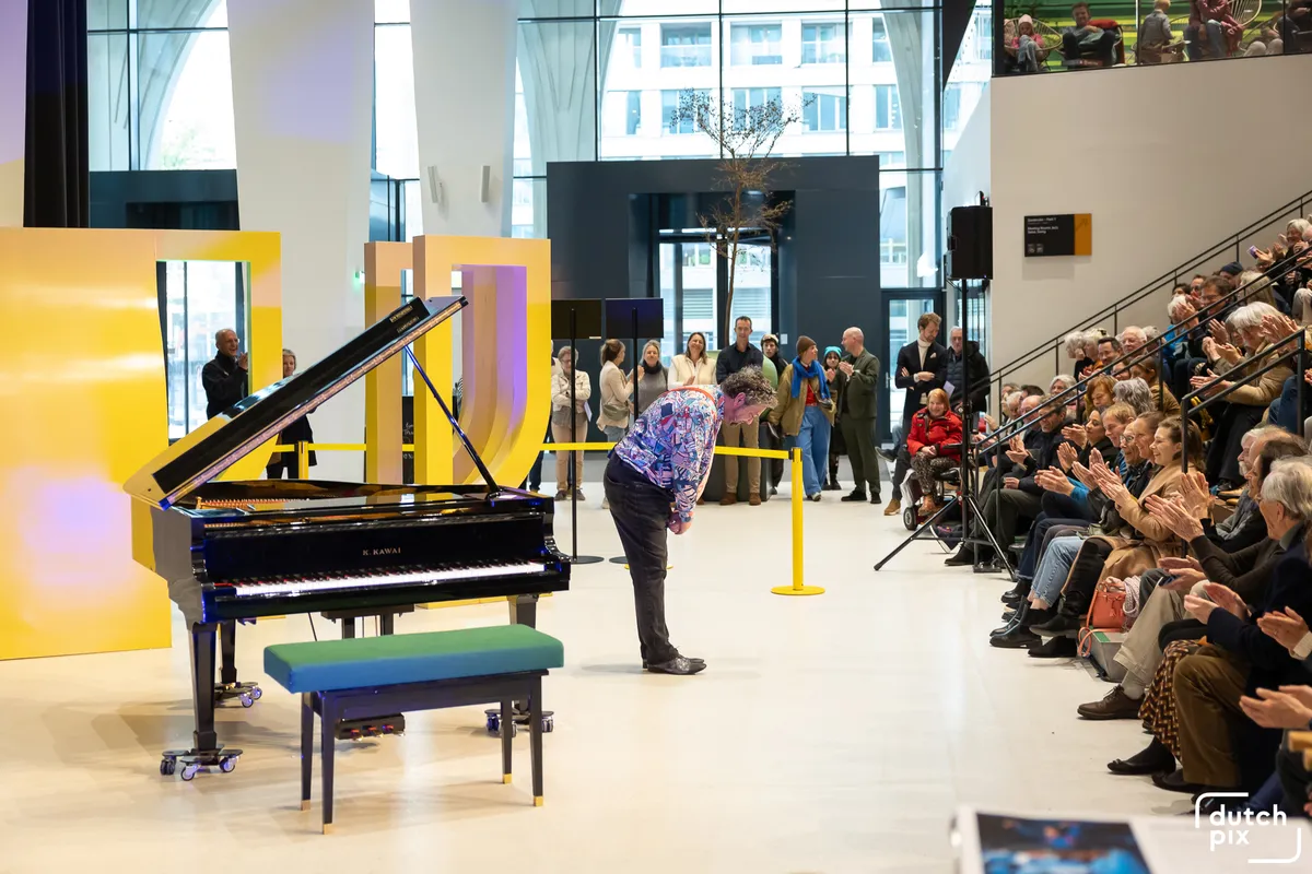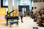 Het eerste voorprogramma wordt vanavond verzorgd in de hal van Amare door de charismatische Mike Boddé. Braaf nemen we plaats op de overvolle tribunetrappen, waar deze gratis toegankelijke performance plaatsvindt. De pianist bouwt een mooi mentaal decor voor de avond op bij de luisteraar: welke keuzes maken componisten bij het schrijven en improviseren van een stuk muziek? Op basis van de letters van de namen van twee aanwezigen improviseert hij een stuk. “Maar hoe maakt u die keuzes dan?” wil een nieuwsgierig publiekslid weten. Geduldig praat Boddé ons door de verschillende muzikale afslagen heen die hij neemt tijdens het spelen. Maar de grote componisten van toen, betoogt Boddé, hebben al die theorie nooit nodig gehad. Die voelden gewoon wat zou werken en wat niet.