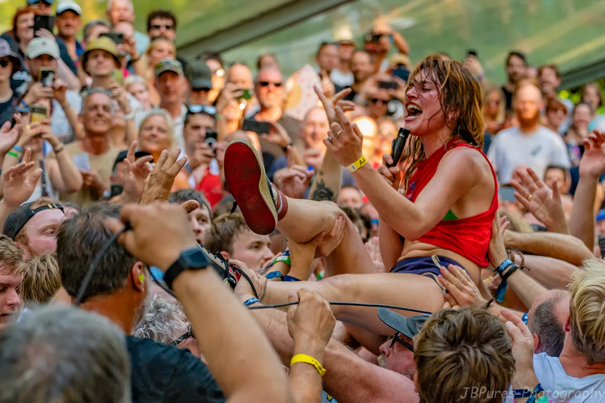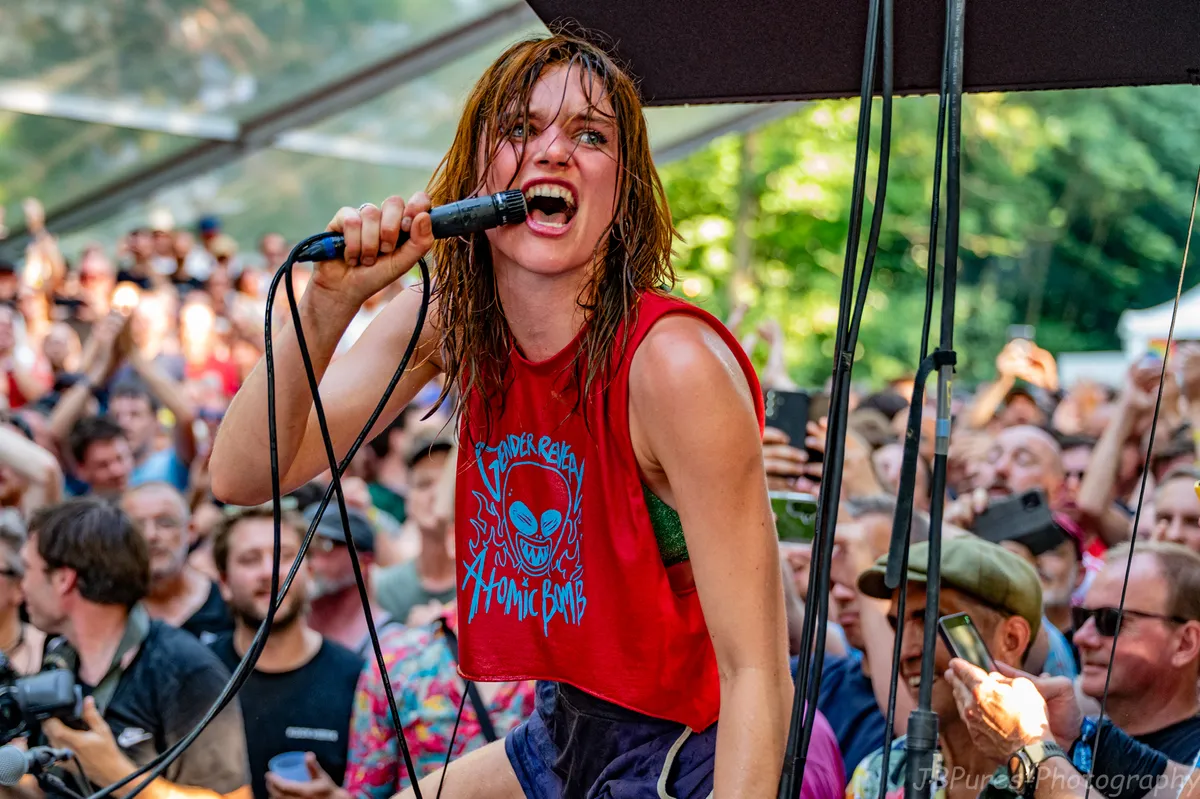 Van de strakke fuzzrock van de Gentse formatie Ramkot, die op het hoofdpodium een uitstekende performance levert, gaan we naar de explosieve postpunk van het Ierse SPRINTS in de Club. Steeds meer bezoekers wagen het om op het podium te klimmen en te stagediven, de een wat voorzichtiger dan de ander. Naarmate de dag vordert zien we trouwens steeds meer mensen met pleisters op tenen, armen en hoofd. Enig causaal verband lijkt ons niet verrassend. Richting het einde van de set maakt SPRINTS-frontvrouw Karla Chubb een duidelijk statement: “Het is een privilege om als band een (letterlijk en figuurlijk) podium te hebben en we gebruiken het om op te roepen tot vrede en verdraagzaamheid.”
