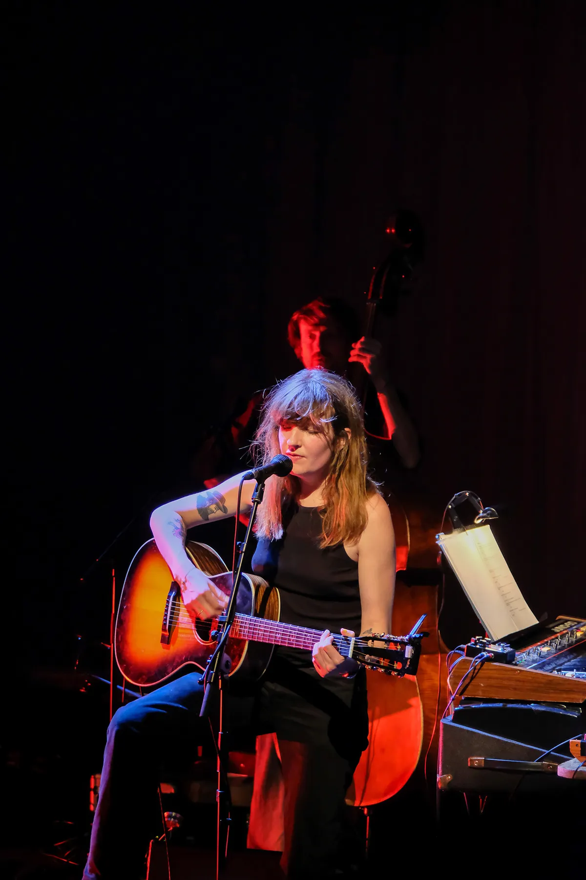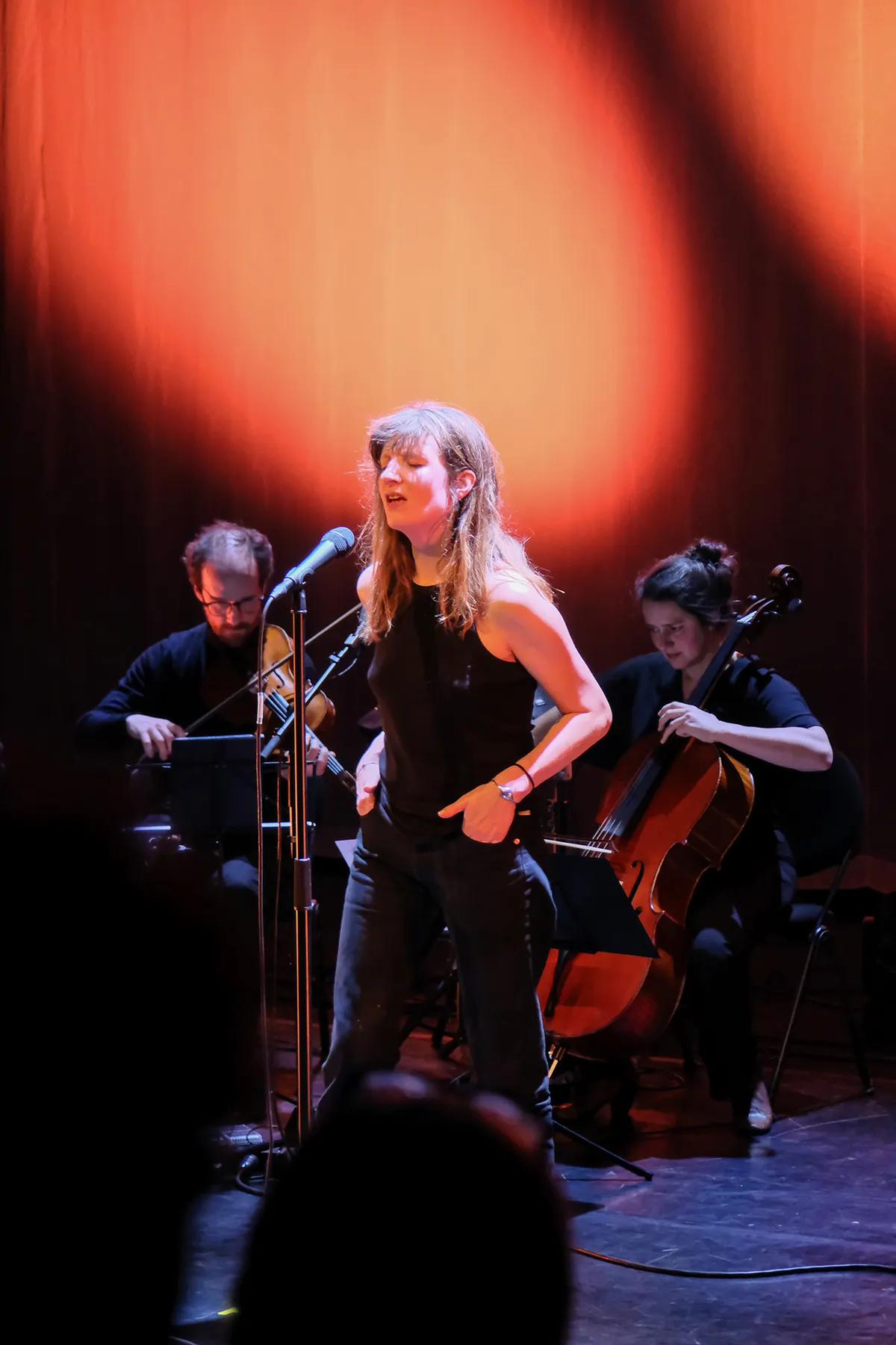 De zang van Roos klinkt loepzuiver en ze schakelt makkelijk (althans, zo lijkt het) een paar octaven hoger, zoals in het nummer ‘Sirene’. Haar zang is de ene keer ingetogen, een andere keer weer heel intens. Roos is authentiek, in hoe ze praat, wat ze zegt, in hoe ze zich beweegt over het podium. Dat maakt haar tamelijk uniek. Je houdt van haar liedjes of niet. Maar wie goed luistert naar haar teksten weet dat haar woorden er echt toe doen. Roos is niet meer het meisje met het rode piekhaar van weleer. Nee, vanavond staat hier een volwassen vrouw die de klappen van de zweep inmiddels verstaat en op ‘Rodeo’ met briljante beeldspraak zingt over de tegenslagen in het leven: “zie me liggen in het natte stro / dit is niet mijn eerste rodeo’. Op gepaste wijze verdwijnt ze halverwege het nummer achter de opzwellende strijkers waardoor het orkest in volle kracht kan excelleren en wij in een soort van extase geraken. Het zal niet de laatste keer zijn deze avond dat SunSunSunOrchestra ons in vervoering brengt. Alle leden van het ensemble krijgen hun verdiende aandacht. De ene keer is het de cello en een andere keer weer de altviool die bij ons de juiste snaar weet te raken. Samen met de andere strijkers zorgen ze voor een sfeerrijk klankenpallet en brengen ze het beste in elkaar naar boven. Dit alles bij elkaar gehouden door bandleider Tim Vandenbergh die al plukkend of strijkend op de snaren van zijn contrabas het fundament vormt van het orkest. Zelfs zijn gitaarkoffer gebruikt hij om het ritme te bepalen (met schoenen uit, al tikkend met zijn voeten).