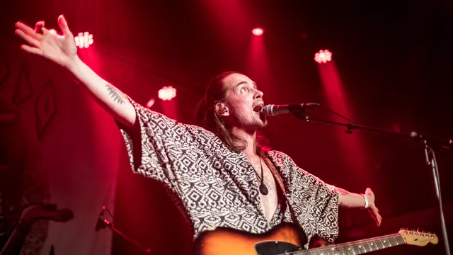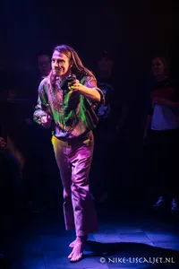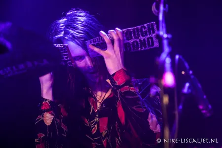 De band speelt met drie aanvallers, en niet alleen qua zang: de zanger is erg extravert en kijkt kwaad, geschrokken of verdrietig, net wat het nummer vraagt. Hij danst op blote voeten heen en weer, voor zover dat gaat op het propvolle podium. De andere twee die vooraan op het podium staan, zijn gitarist Bart Lybeert, in een schitterende kimono, en toetsenist Sebastiaan Openhaart, die gracieus meedanst en hartstochtelijk meezingt. De range van leadzanger Vincent is breed: van een hoge kopstem die aan Wouter Mol doet denken tot het slotnummer 'Caveman', waarin hij lekker laag gromt als een ork. De meeste toeschouwers komen pas tijdens dat nummer binnen - ze hebben wat gemist.