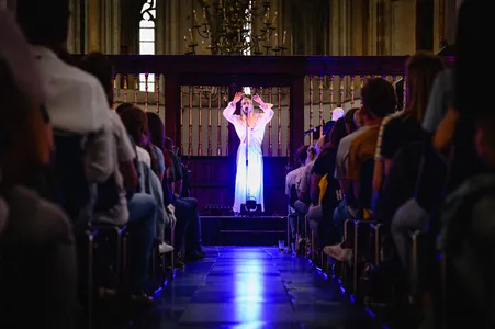Buiten is het nog licht als S10 om half negen aan haar set begint, geflankeerd door haar vaste producer Sim Fane en een gitarist. S10, Stien den Hollander, is volledig in het wit gekleed en heeft haar zittend publiek al snel mee met haar zang en de mix van indie hiphop en Nederlandstalige pop met een urban beat. Veel nummers van haar recente album ‘Vlinders’ komen voorbij, het bombastische ‘Crystal Clear’, melodieuze ‘For Days’ en ‘Maria’ (in een kerk!) maken indruk. Buiten wordt het langzaamaan donker en de lichtshow zorgt voor grote silhouetten achter de artiesten. De setting maakt het optreden extra speciaal.