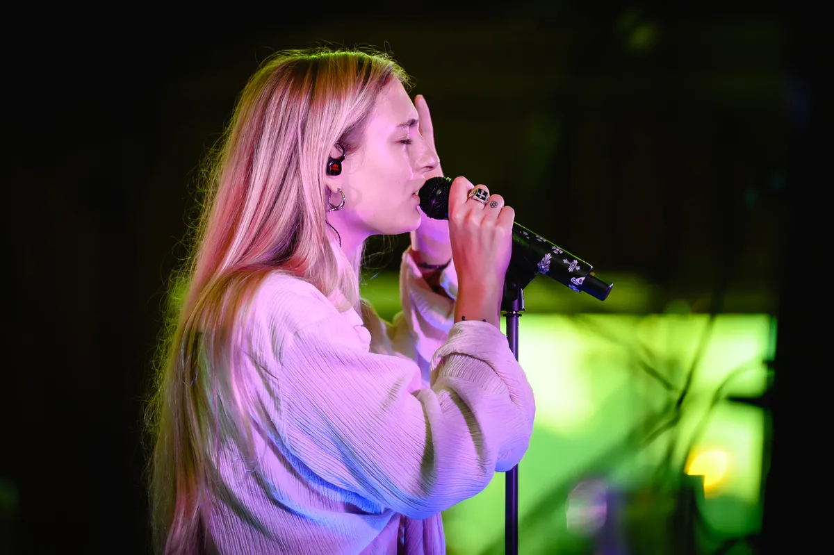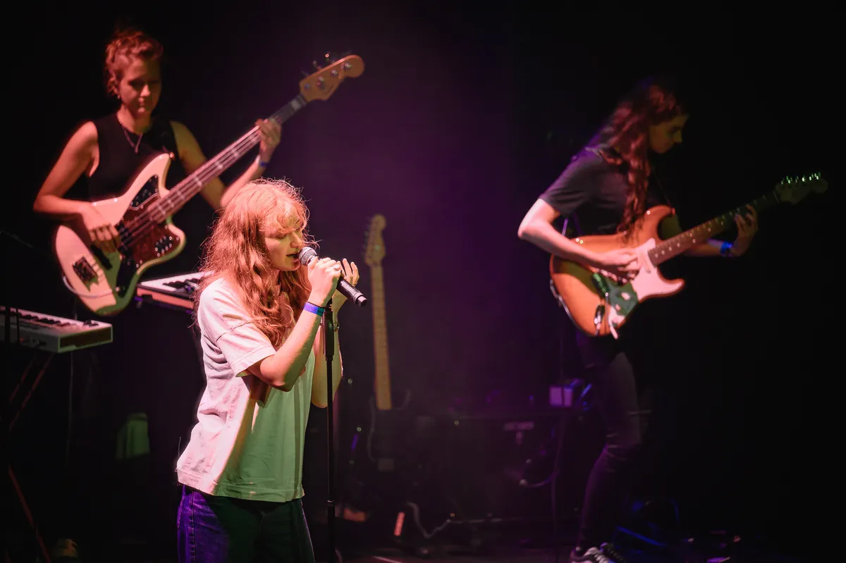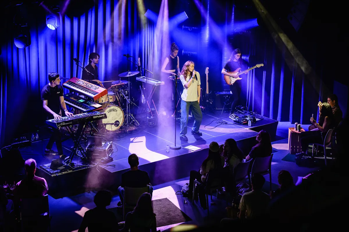 Froukje vierde vorige week op Crammerock in België haar twintigste verjaardag met een vrolijk ‘Ik Wil Dansen’ voor dik 13.000 festivalgangers. Maakt dat het optreden in de intieme Mezz met zittende mensen dan minder? Nee, helemaal niet. Ze vindt het zelfs een mooie opwarmer voor de najaarstour, als er straks in Nederland ook hopelijk meer mag. Het publiek krijgt een energieke, frisse set voorgeschoteld. Het sterke optreden start met doorbraak- en klimaatcrisissingle ‘Groter Dan Ik’, met een dikke clubvibe en heerlijk gitaarlijntje. Sowieso zorgt de eveneens piepjonge band ervoor dat Froukje sterk en zelfverzekerd op het podium beweegt.