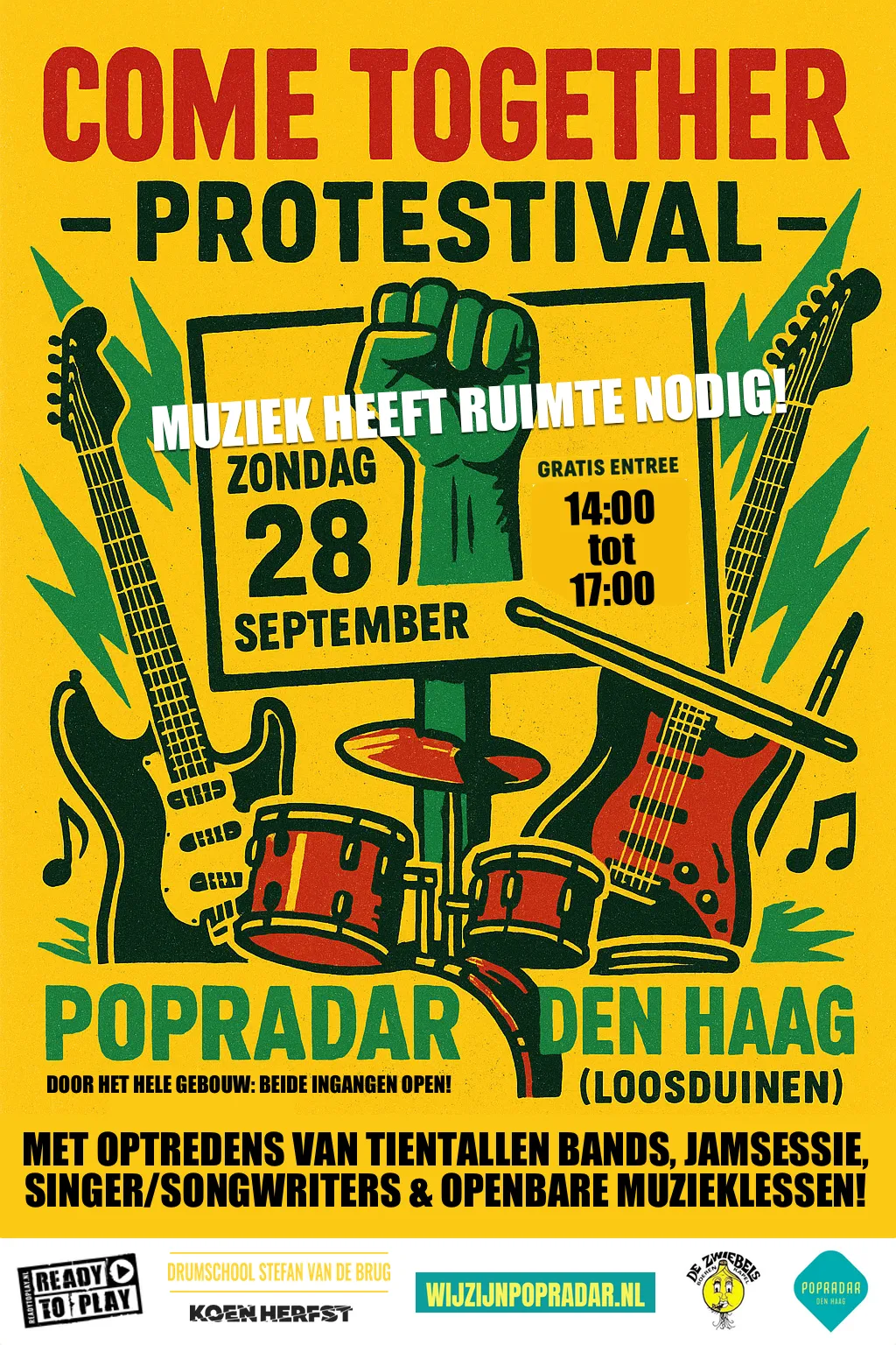 Zekerheid is er daarmee echter nog niet, en daarom is er vandaag COME TOGETHER, een initiatief van de huurders. Het gebouw zit altijd stampvol activiteit, maar op dit ‘protestival’ gaan alle deuren open om iedereen te laten zien wat hier allemaal gebeurt. En dat betekent optredens, jamsessies, workshops en muzieklessen in de gang, oefenruimtes, en lokalen. Drukte en lawaai, precies waar wij van houden!