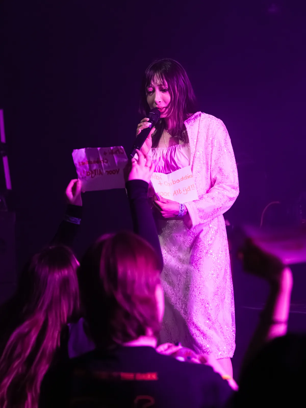 Tijdens het nummer ‘Prachtig’, van debuutalbum SABINA (2022), springt ze op een verhoging naast de drummer, waar ze in het vervolg van de show nog veel zal dansen. Over de synthesizers en het diepe basgeluid klinkt bijna rappend de hoge stem van Chibi Ichigo. Dat je deze muziek live moet ervaren, is een feit. Je moet dit niet alleen horen, maar ook voelen. Deze muziek fungeert als uitlaatklep, een uitnodiging van de zangeres om even alles te vergeten en schaamteloos te dansen. Vlak voor de climax van de show halen verschillende mensen uit het publiek briefjes tevoorschijn met de tekst: “Chibi Ichigo, Voor Altijd”. Ze refereren aan haar nieuwe nummer ‘Niet Voor Altijd’, dat gaat over het beschermen van je geliefde, maar ook over het leren loslaten. Als de achtentwintigjarige zangeres de briefjes ziet wordt ze eventjes emotioneel: “Ik ga dit nooit meer in mijn hele leven vergeten’’, snikt ze.