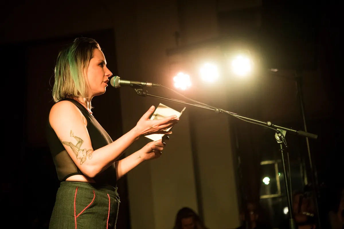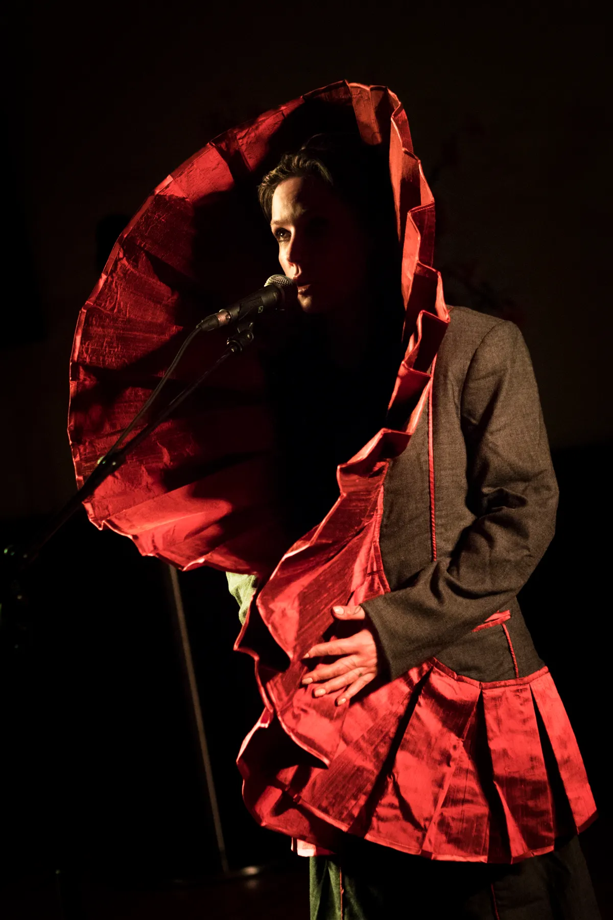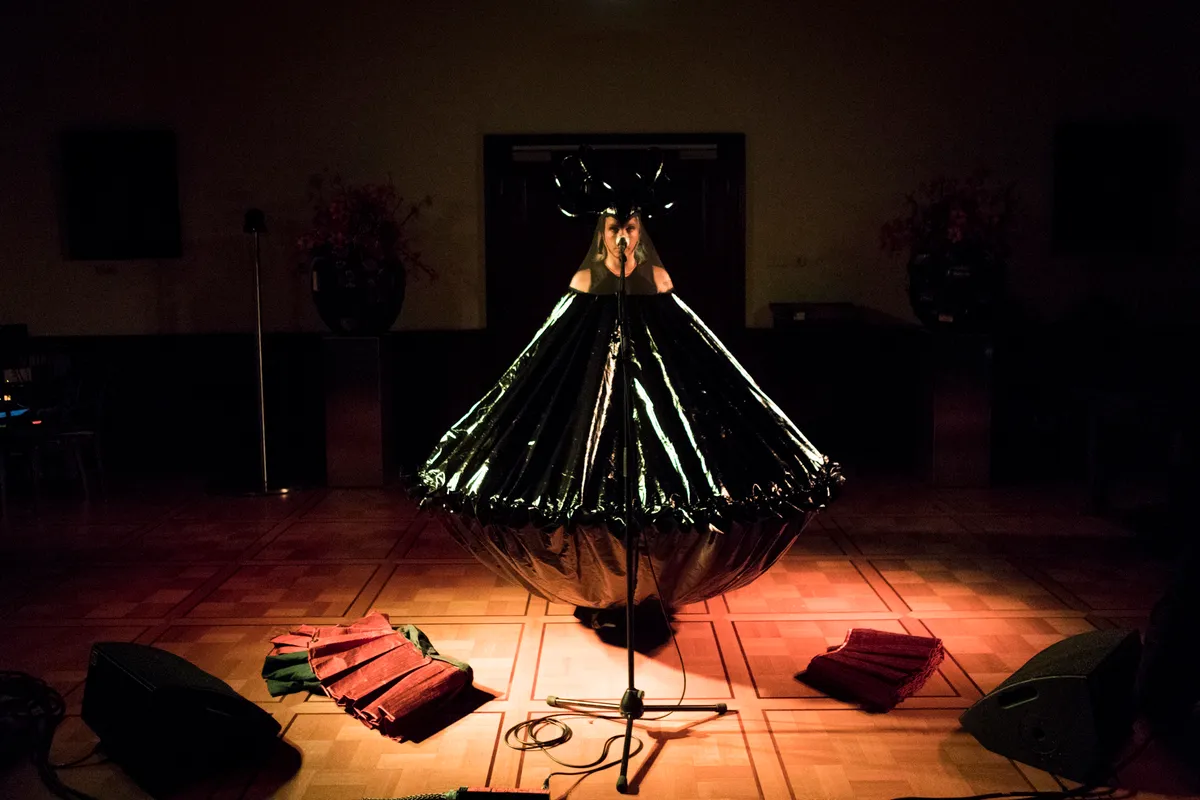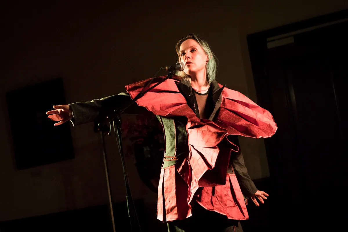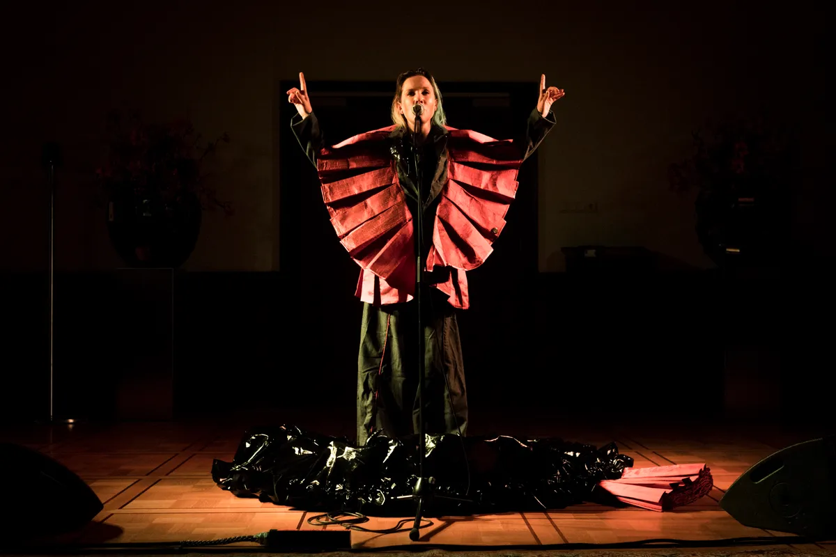 De deur naar de Trouwzaal blijft dicht tot vlak voor het optreden begint. En dat heeft een reden: Aafke heeft een grote zwarte, ballonvormige outfit aan waardoor ze eigenlijk statig op de plaats moet staan, met een doorzichtige sluier en een kroon met hoorns. Misschien zorgt dat er ook voor dat de toeschouwers pas klappen na het tweede nummer. Even wennen. Maar dat is niet erg, het is eerder interessant en boeiend. Romeijn wisselt tijdens het optreden vaker van uiterlijk door stukken van Teuns ontwerp toe te voegen of weg te laten. Alleen, met enkel een begeleidingstrack, stoer en breekbaar, brengt ze Nederlandstalige liedjes over vaak breekbare onderwerpen of onderwerpen die vragen om discussie. Denk aan ‘Piepschuim’, haar recente single over een slaapmiddel en het gevoel dat daarbij hoort als je middenin een depressie zit. Tussendoor draagt ze een gedicht voor uit eigen werk: ‘Dingen Zien Branden’. Het is een sterk optreden dat om aandacht vraagt, zowel visueel als tekstueel. Eén van de hoogtepunten van de avond.