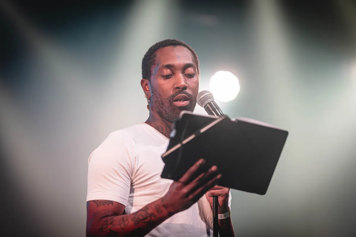 Ray Fuego is een van de oprichters van het collectief SMIB. Hij bestaat samen met een paar andere jongens uit de harde kern en heeft ondertussen als soloartiest ook al een naam gemaakt. Buiten SMIB heeft hij ook succes met zijn punkband Ploegendienst. Hij is van alle markten thuis en vanavond laat hij wederom weer wat anders zien: poëzie. In een simpel wit T-shirt en zwarte spijkerbroek wandelt hij het podium op met z’n notitieboekje. Ietwat bescheiden bekent hij dat hij eigenlijk niks heeft voorbereid, dus hij leest gewoon wat voor. Gedichten over het gevoel van thuis, over zijn roots en over liefde maakt de zaal zwijgzaam. Hij vertelt over zijn vakantie op Curaçao, waar hij vandaan komt en waar hij een maand lang zichzelf kon terugvinden tijdens een moeilijke tijd waarin hij zich eenzaam voelde. Zijn notitieboek is een intieme blik in zijn hoofd en bewijst Ray Fuego’s status als echte kunstenaar, naast het zijn van reeds succesvolle artiest.