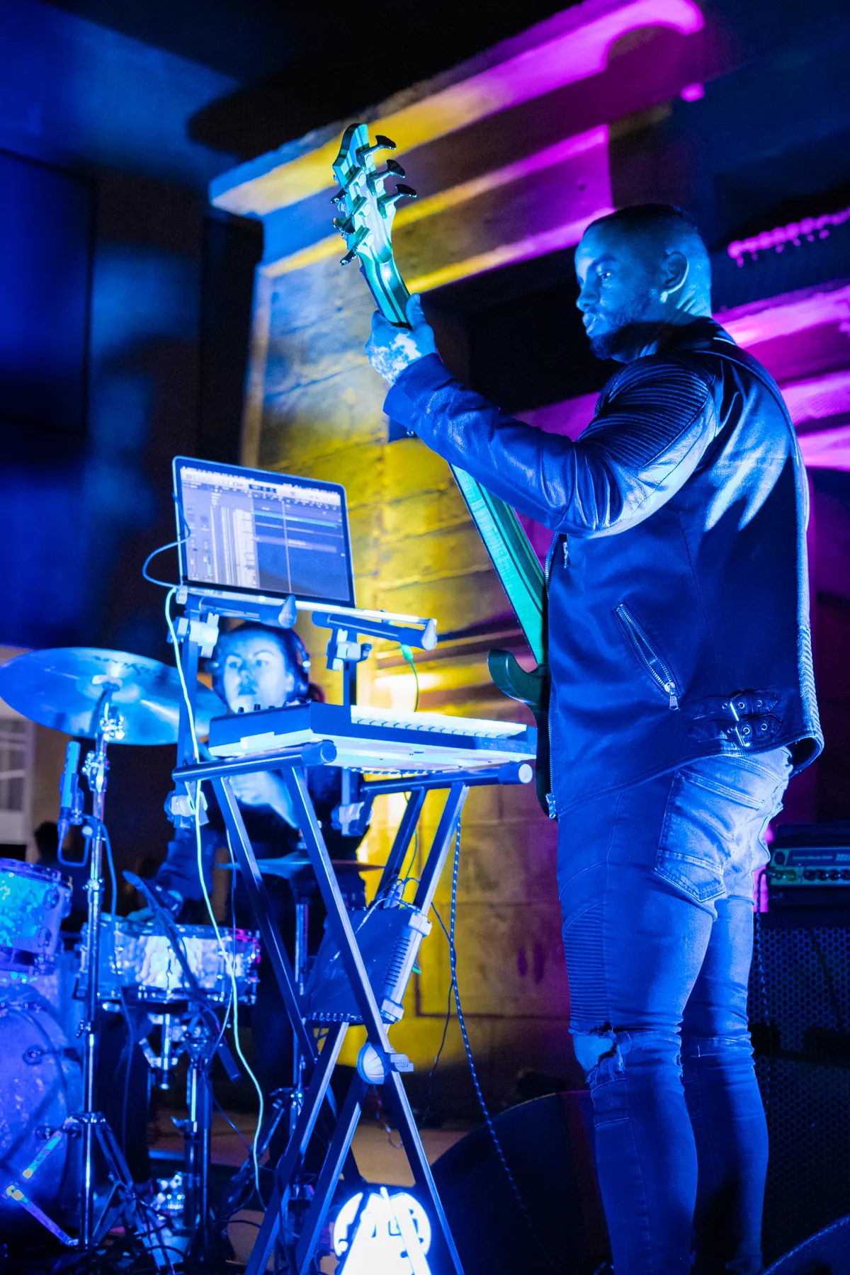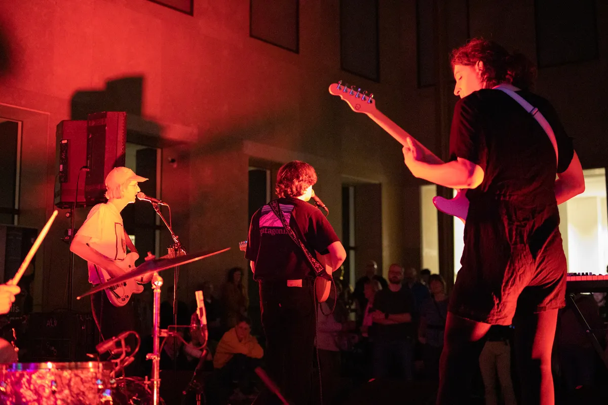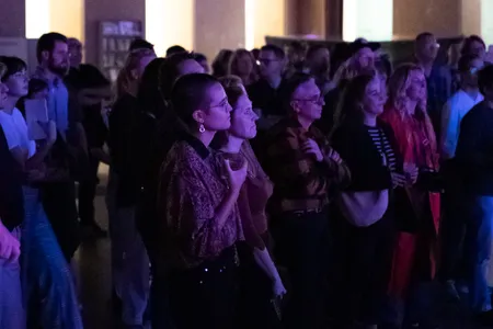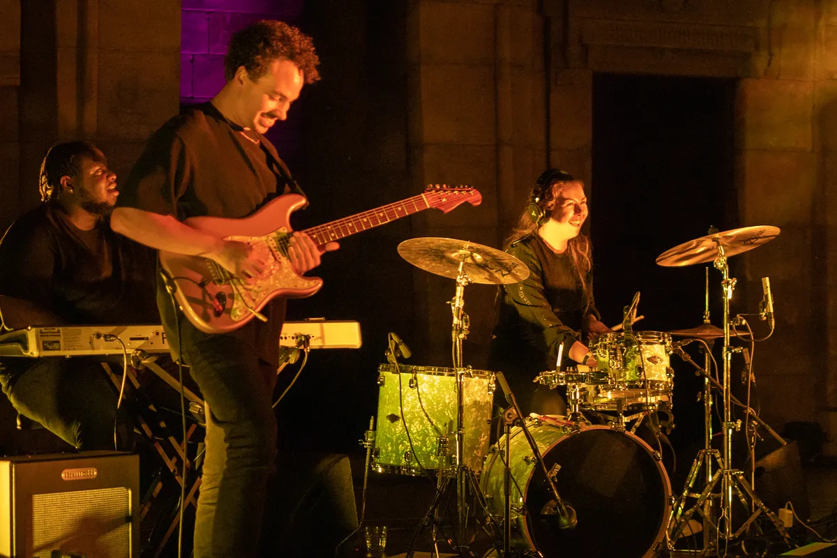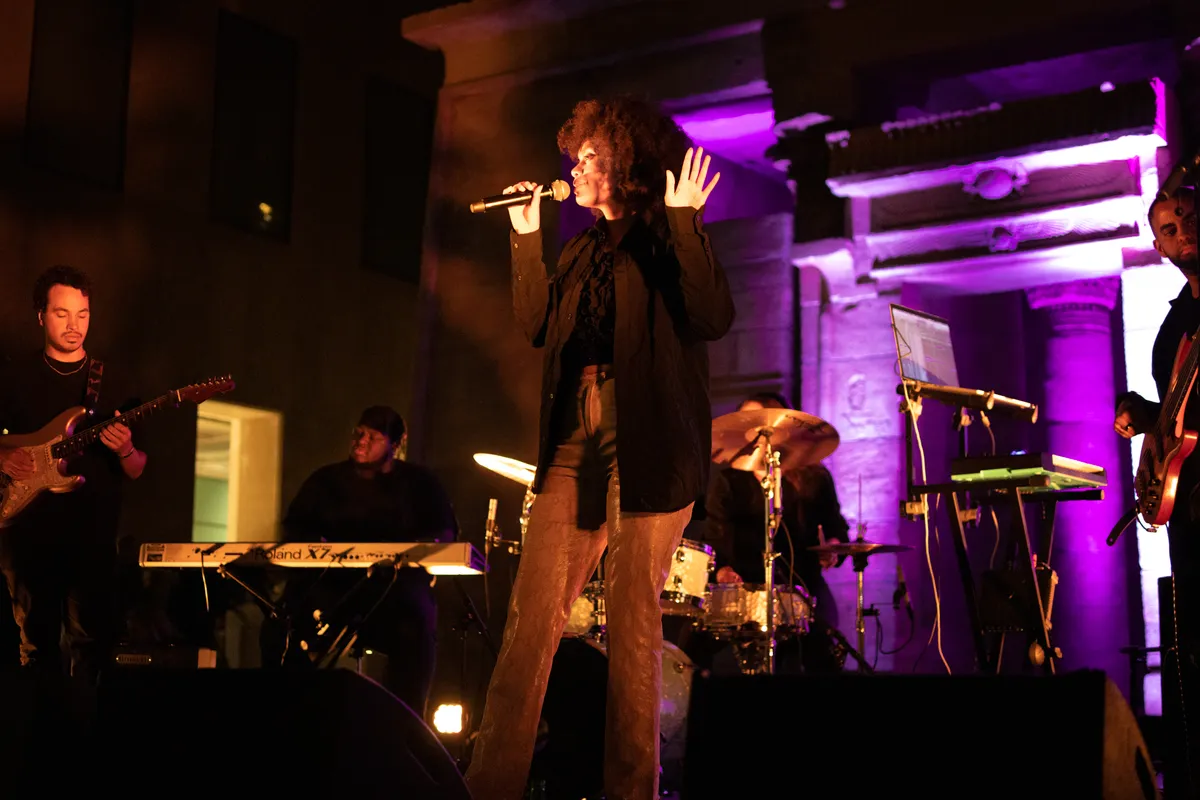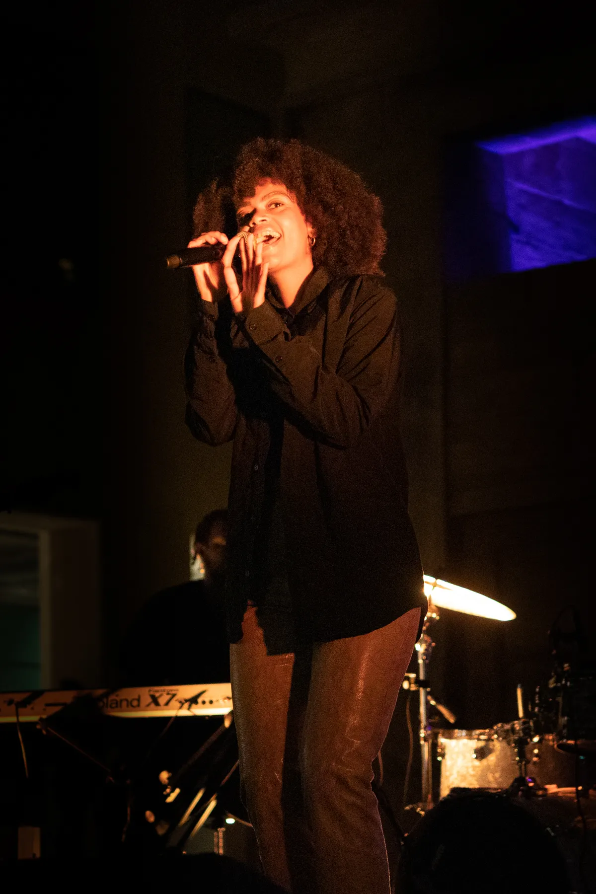 Een half uur na het optreden: Joya Mooi heeft de bühne overgenomen. Waar de voorgangers van deze deels Zuid-Afrikaanse zangeres het publiek prikkelden tot dansen, is er bij haar eerste nummer nog geen beweging te zien. Niet gek, het is te makkelijk je met gesloten ogen te laten meeslepen door het jazzy, easy going-geluid. Ze is voor het eerst in Leiden, zegt ze na het tweede nummer, maar van zenuwen is helemaal niets te merken. Met een North Sea Jazz-waardige uithaal tijdens de zesde track kan ze op flink applaus rekenen. Tussen de nummers door vraagt ze het publiek nog een keer naar voren te komen, “dan wordt het wat minder eng”. Ondertussen schuwt ze een politieke boodschap dan weer niet, zoals bij het nummer ‘Good girl’ (“over dat je als vrouw alles mag dragen dat je wilt dragen”). Niet alleen haar persoonlijkheid is gelaagd: er zit veel variatie in haar songs. Daardoor wil je, ondanks het langzame tempo, blíjven luisteren. De zaal valt stil tijdens haar laatste nummer ’My favourite’, over “degenen die je steunden tijdens corona”. Nog één noot, nog één akkoord, de tempel kleurt donkerblauw. Daarna klatert het zeer verdiende applaus over haar en haar bandleden heen.