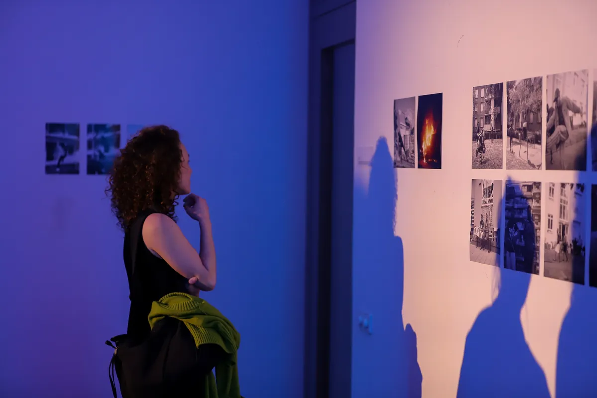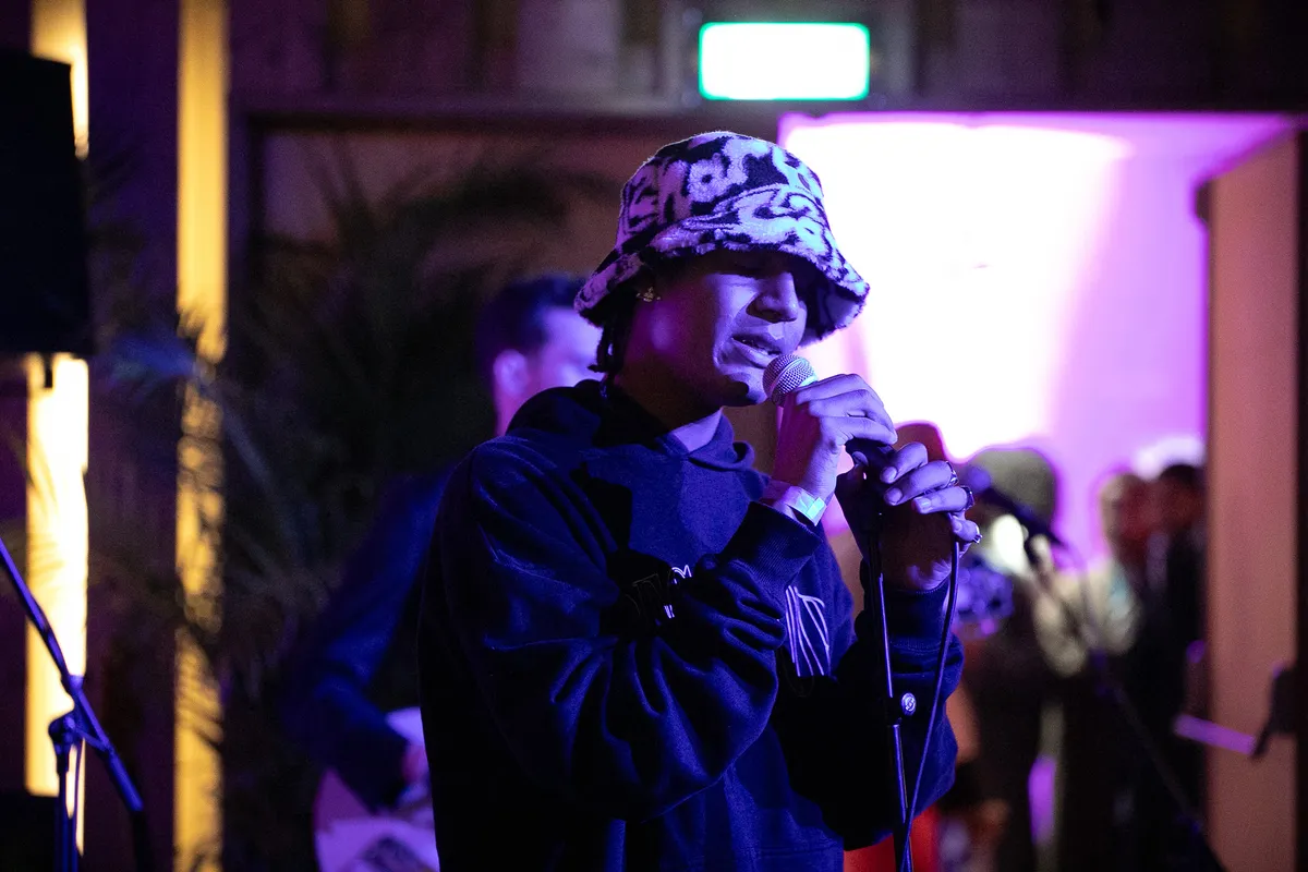 Het nieuwe ‘culturele verzamelgebouw’ van poppodium PAARD, GR8, is een modern maar sfeervol pand. Door de vele deuren en verwarrende lay-out is het even zoeken waar je moet zijn, maar gelukkig kom je bij Sidewalk Hustle hoe dan ook bij iets interessants uit. Op de begane grond is de expositie te zien, waar sociaal geëngageerde fotografie en videografie te zien is van Nas Hosen en Bart Sturing. Zij gebruiken de straat en de stoep (sidewalk) als lens om alledaagse beelden met een rauw randje te vertonen. In de hal draait DJ SIEM relaxte muziek, terwijl er hard genetwerkt wordt door de Haagse creatieve scene. In elke ruimte zijn kleine stukjes kunst te vinden, van de bloemschilderijen van de Pools-Braziliaanse Kamila Sipika tot de gecureerde vintage meubels die onderdeel zijn van het decor. In de kelder, in een intieme theaterzaal met blauwroze licht en warme houten details, vindt de muzikale climax van de avond plaats.