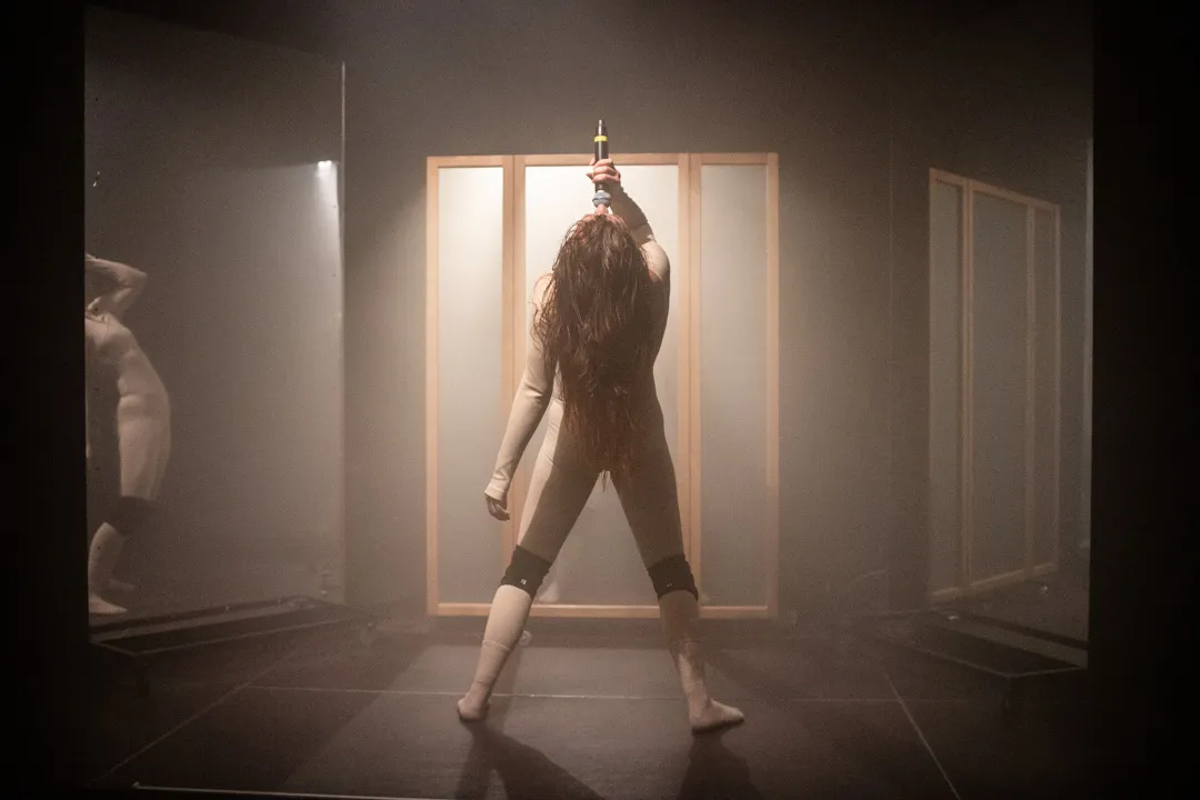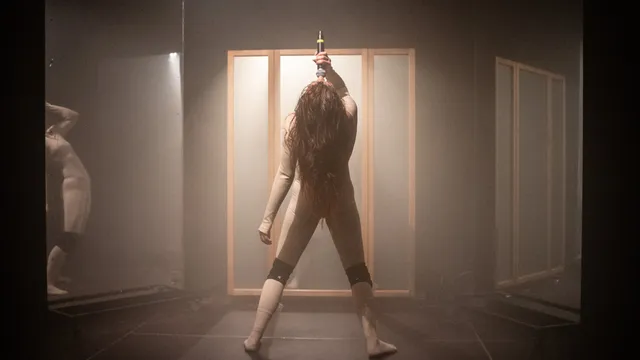 Dan gebeurt er ineens iets: de spiegels die rechtop stonden, vallen tegelijk om, en Arie begint als een bezetene zichzelf op de vloer te werpen en weer op te staan, ze valt, staat op, valt, staat op. Na een tijdje gaat ze dansen als een pop uit een horrorfilm, nog steeds met de rug naar het publiek toe, nog steeds in het donker. We raken daar bijna aan gewend, bijna - tot de spotlights ineens aanschieten en ze ons ineens achterstevoren aankijkt. Ietwat creepy, maar heel cool.