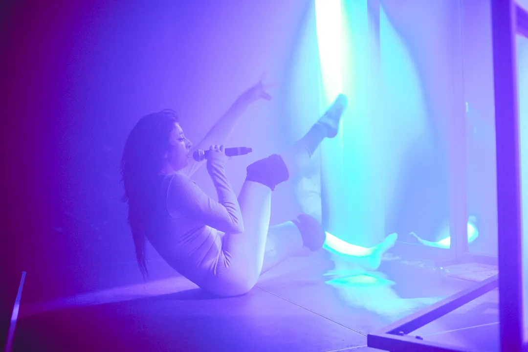 Oh, wat een enorme vibeclash met de volgende act. Het publiek praat met een cocktail in de hand nog euforisch na over de pianoskills van Daniël, als de mysterieuze Arie begint te spelen. Tussen een set van drie spiegels staat ze, met de rug naar het publiek toe, en ze begint elegant te bewegen terwijl op de achtergrond spookachtig gezang begint te spelen. Het licht is gedimd, we zien alleen haar silhouet, en op geen enkele manier maakt ze contact met het publiek, dat op zijn beurt ongemakkelijk heen en weer schuifelt en begint te gniffelen.