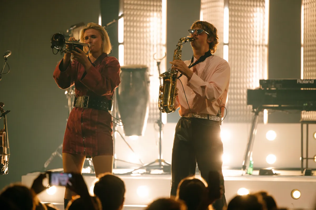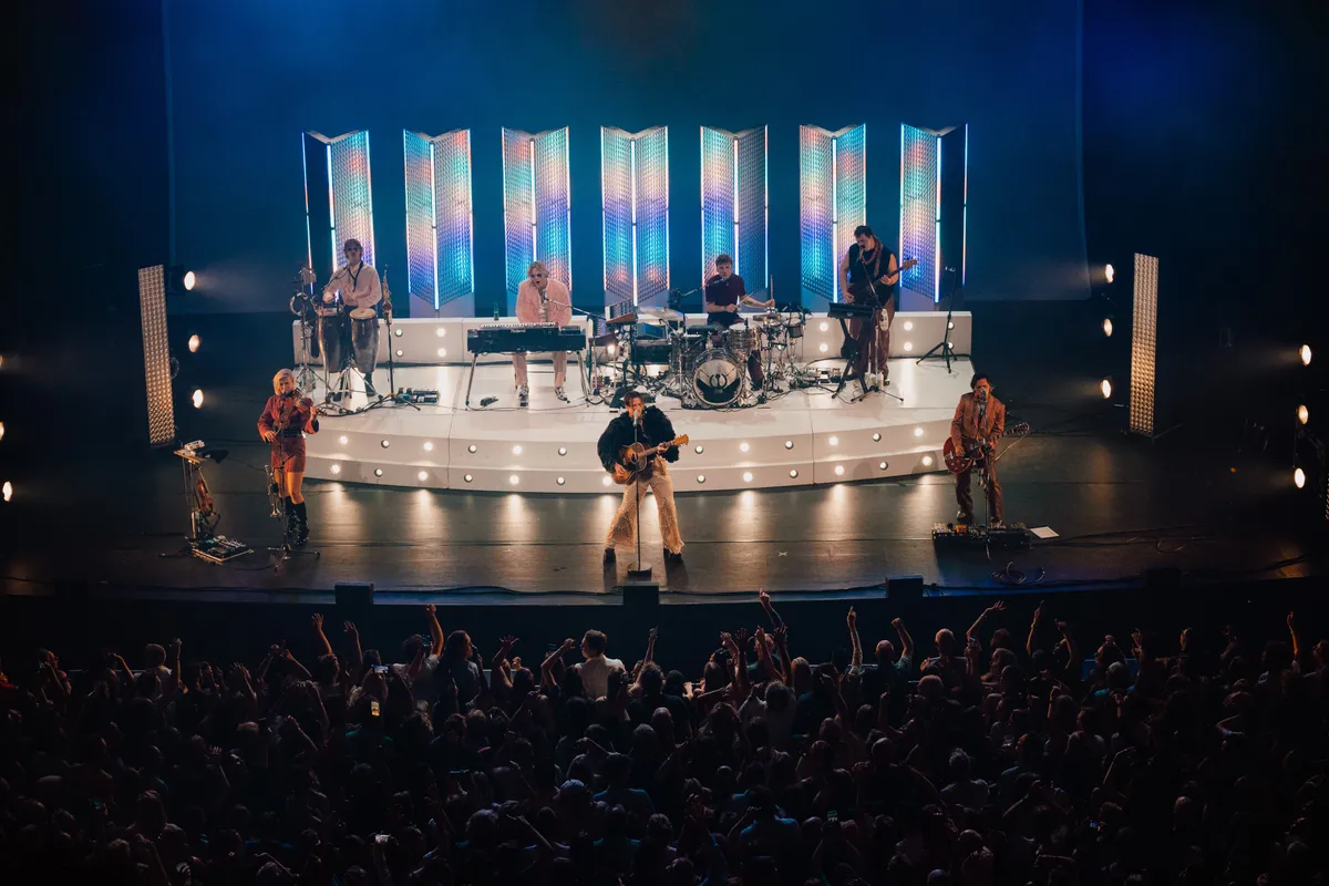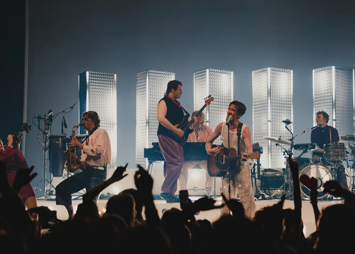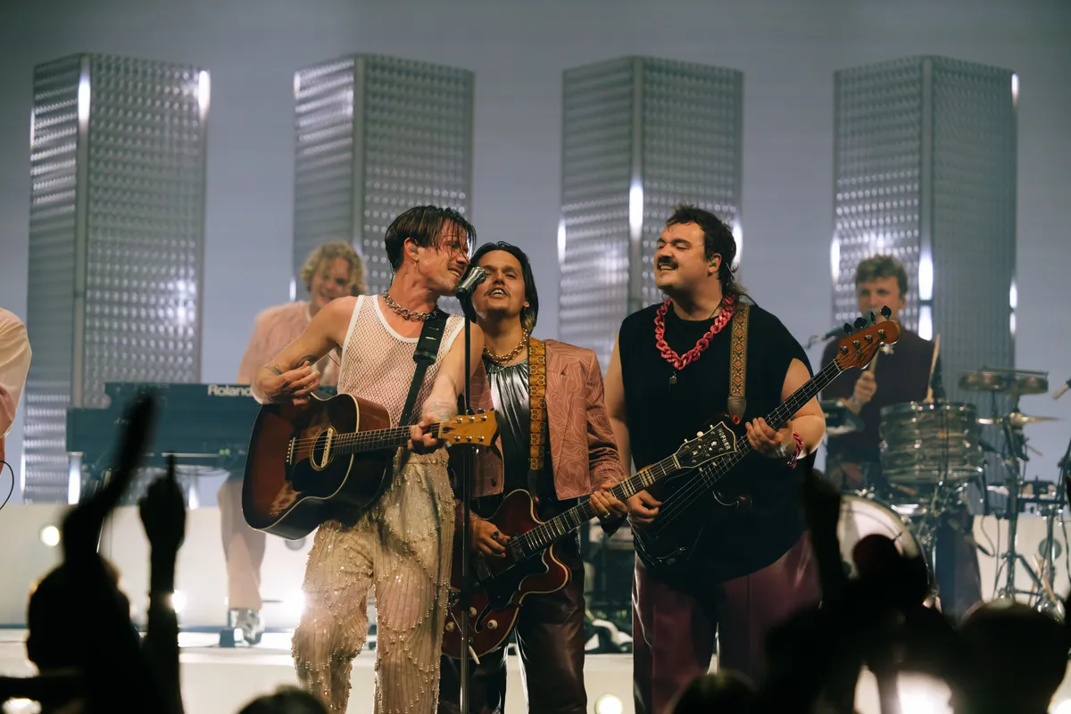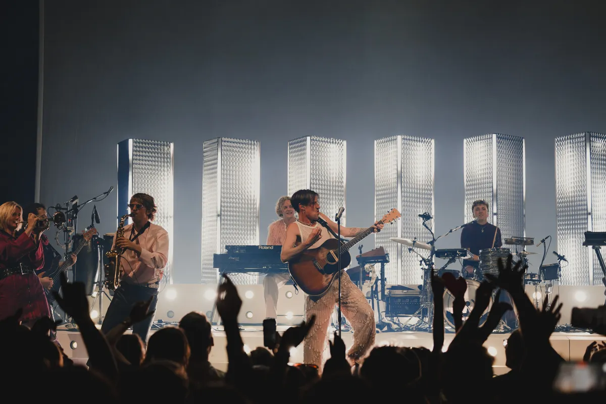 De enkeling die nog niet aan het bewegen is, doet dat wel bij het nummer waarmee de band doorbrak bij het grote publiek in 2022: ‘Multicolor’. Voor dit nummer heeft de band zich razendsnel omgekleed. De leren broek is ingeruild voor een glitterbroek en zwarte bontjas. De energie is hoog en het publiek swingt.