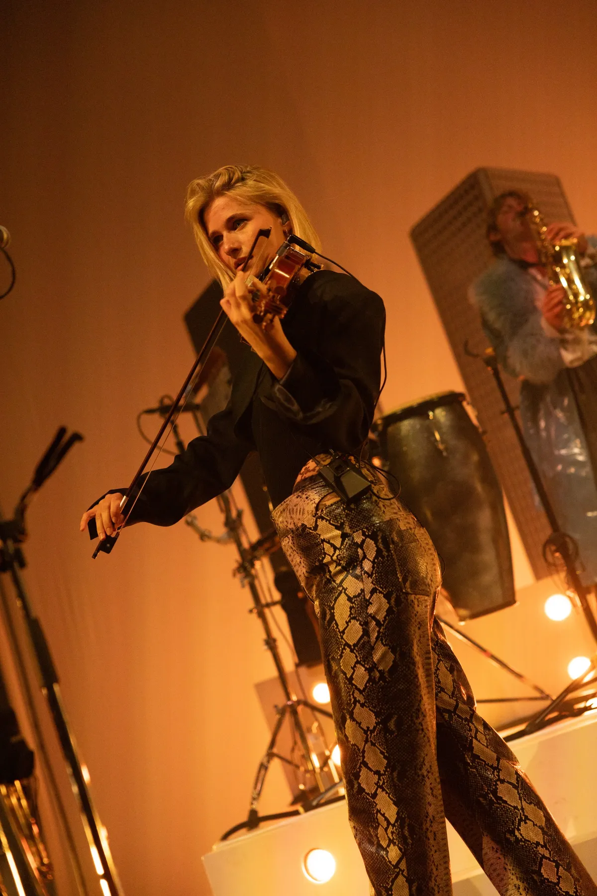 Alhoewel Camiel duidelijk de hoofdrol speelt in dit spektakel, hebben de zes overige bandleden ook een solo-performance. Één van hen is vrouw, Maud Akkermans, die de viool bespeelt. Door alle synthesizers, gitaren en tamboerijn zou je de viool soms bijna vergeten. Tegelijkertijd wordt het saaie imago van dit klassieke instrument vanavond doorbroken.