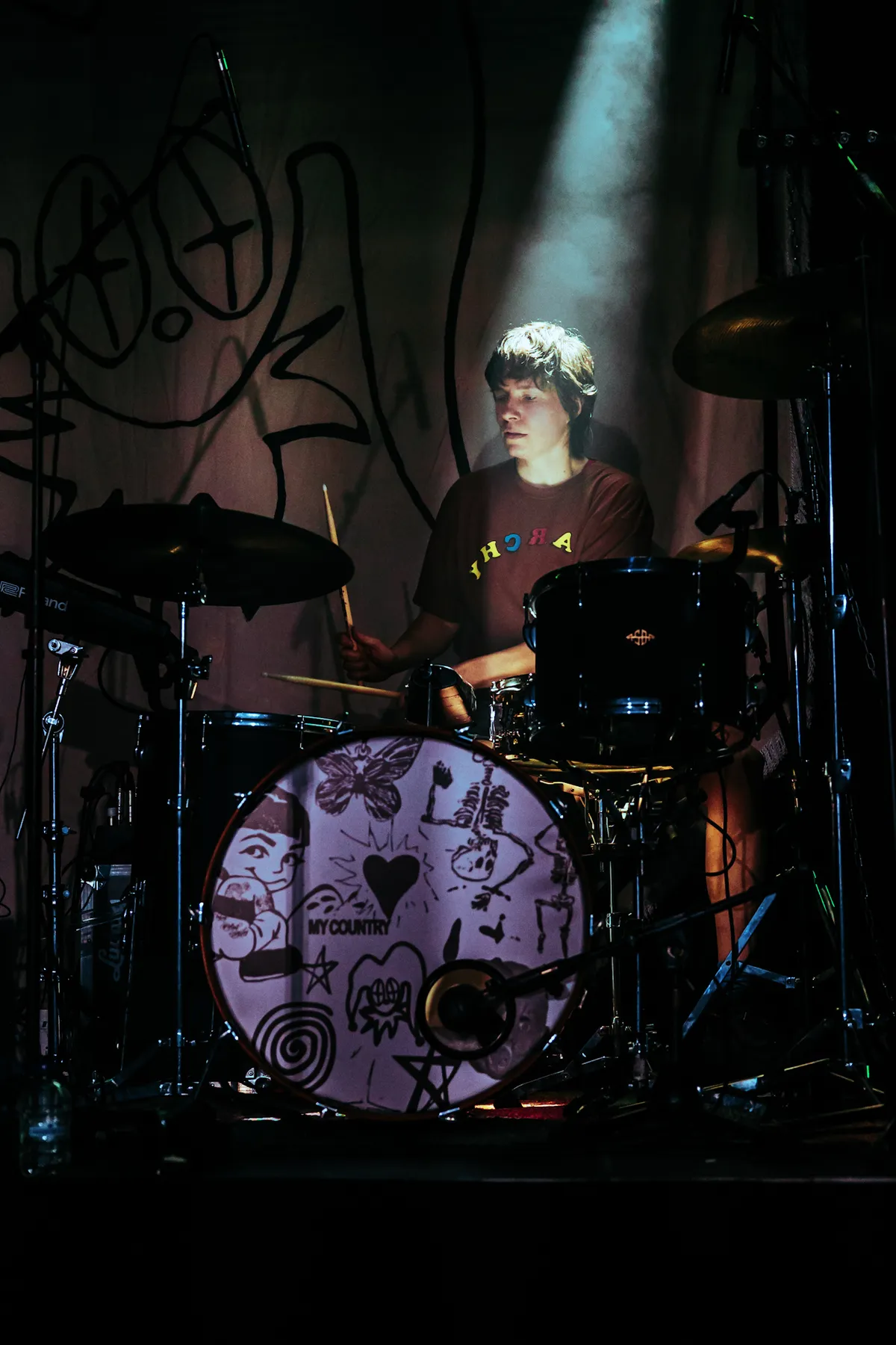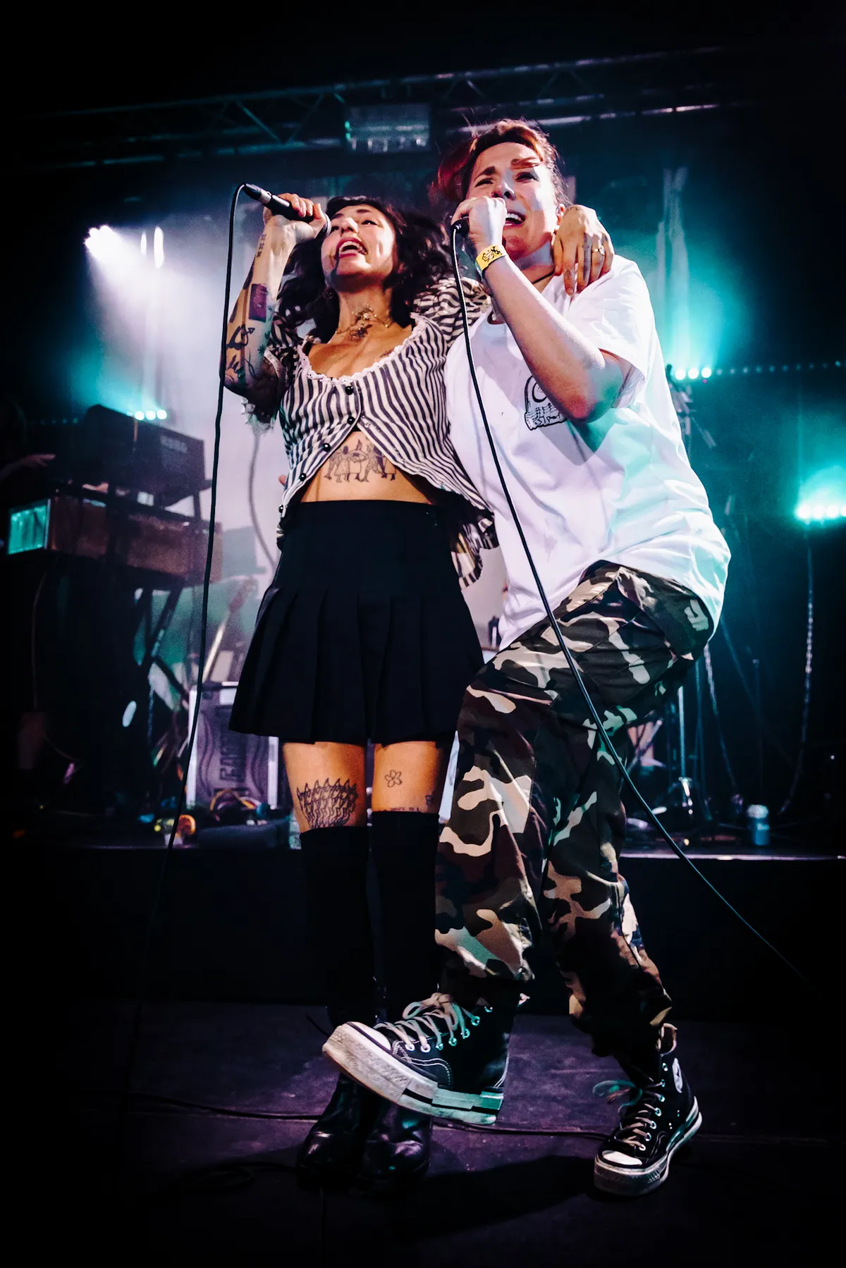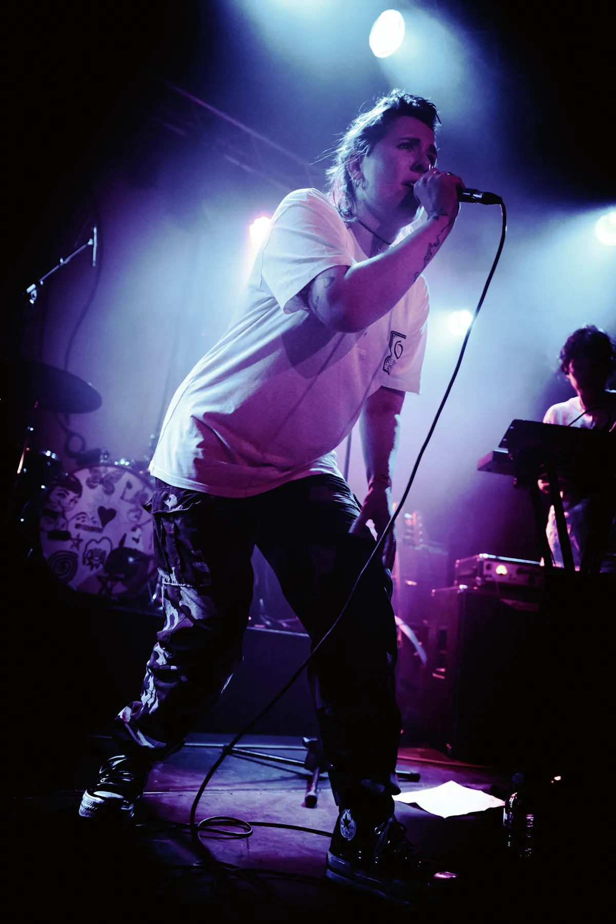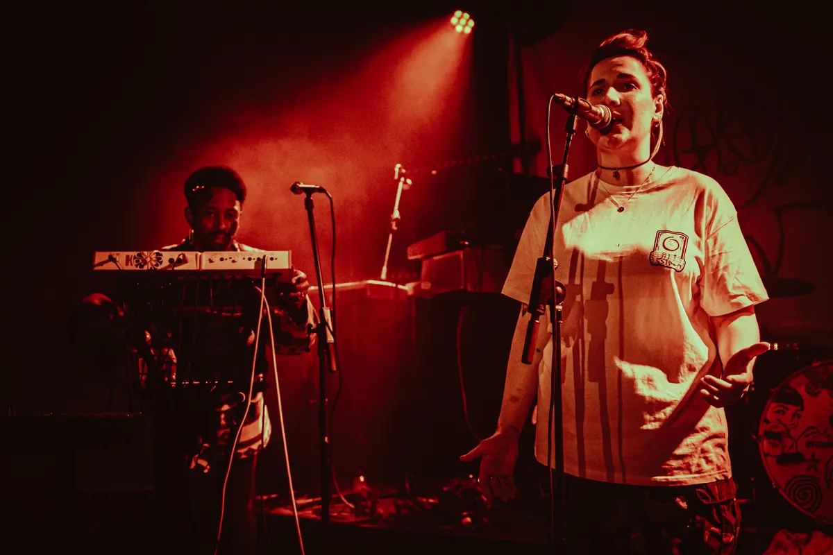 Voordat het de beurt is aan Sophie, mag Fritzi de Hall of Fame alvast laten rellen. Althans, dat probeert ze. Vol zelfvertrouwen en met wat houterige dansmoves combineert ze haar husky vocals met melancholische synths en dubachtige beats. Het begint wat rustig en onwennig, maar Fritzi en haar band schakelen later over naar het hardere werk met licht absurdistische titels als ‘GOEIE DEALER // VERRE VRIEND’ en ‘IK ROOK’. Het publiek bopt grijnzend mee met de rauwe zang over het oh-zo-moeilijke rokersprobleem: stoppen. Toch fijn dat we deze avond nog een beetje kunnen lachen, want hoewel de tranen ons niet nader staan bij de opvolgende set van Sophie Straat, is er wel een shift van problematiek.