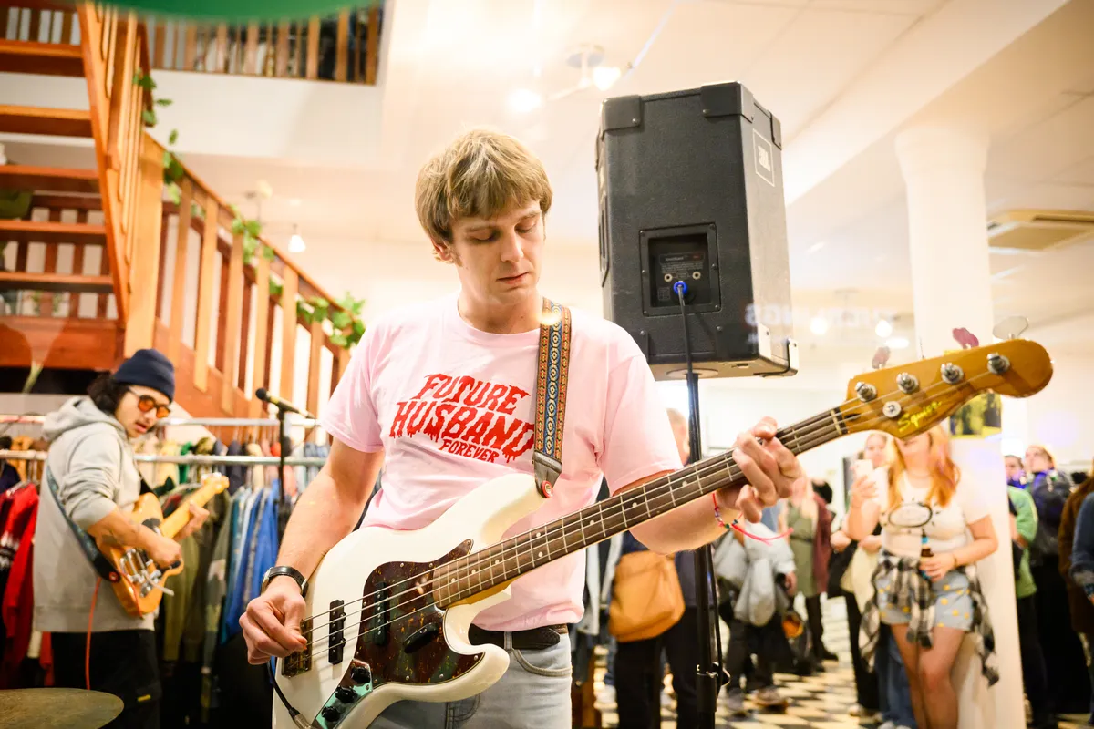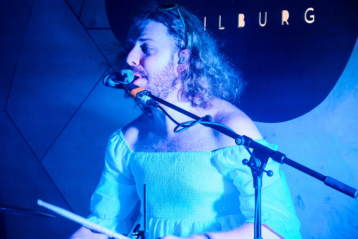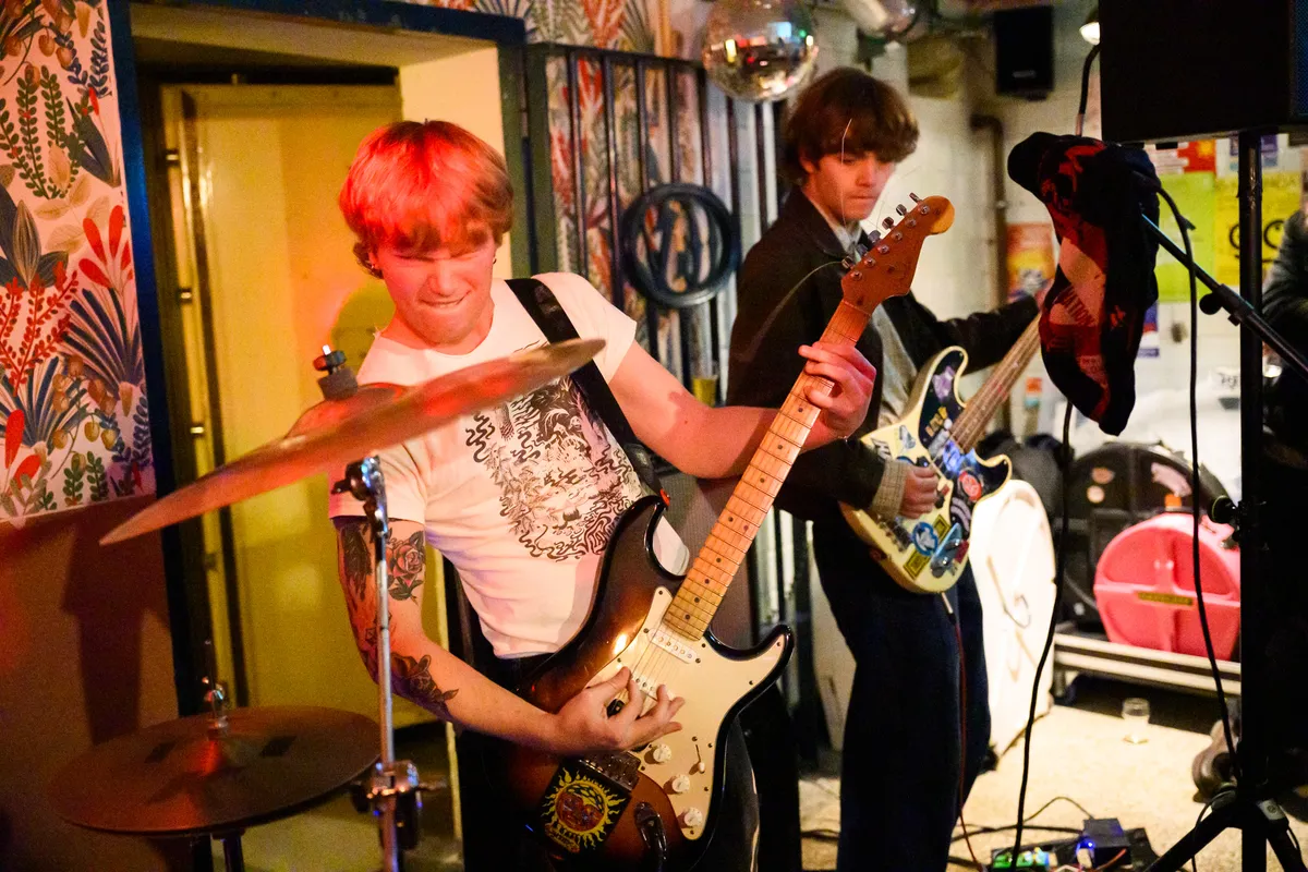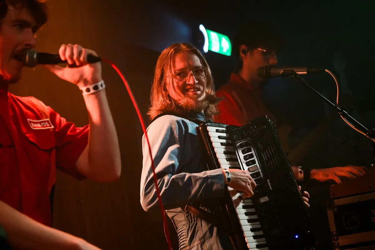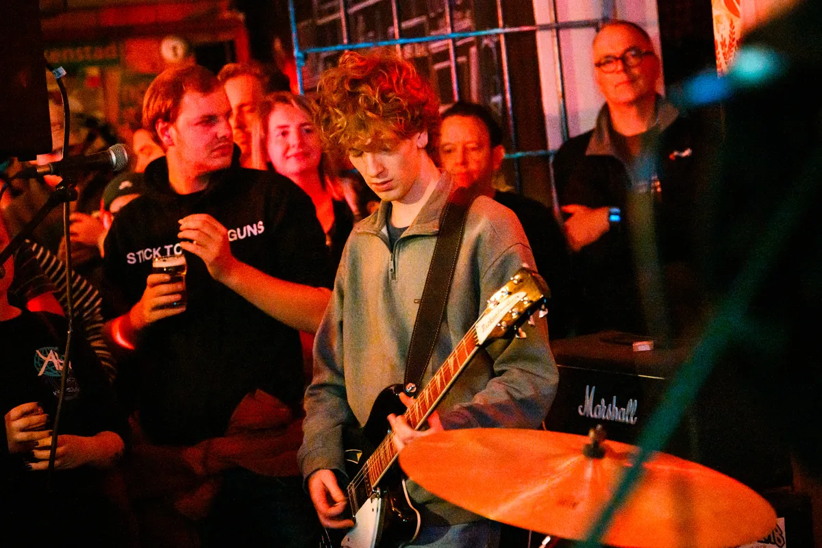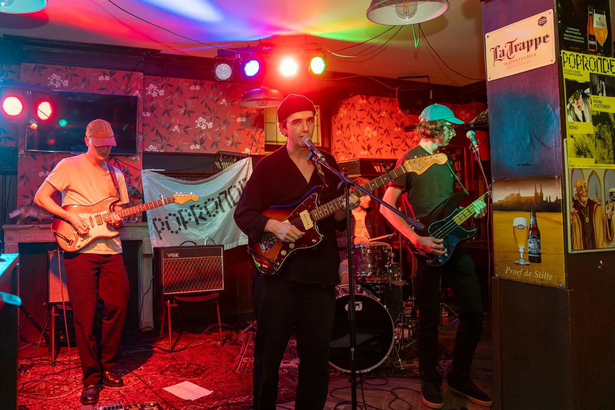From//october, het geesteskind van Dion Tiktak, is typisch zo’n band die het goed doet op je noise-cancelling koptelefoon: dromerige, lo-fi indiepop, die je langzaam meevoert naar je binnenste zelf en die – inderdaad – goed gedijt in de herfst. Muziek voor gevoelige millennials, kortom, maar die zijn op het eerste oog niet ruim vertegenwoordigd in De Vos en de Craen; aan een statafel slurpen luidruchtige studenten glazen wodka-cola leeg, een verdwaald groepje boomers vraagt zich licht vertwijfeld af wat er toch aan de hand is in hun favoriete borrelcafé. Op het podium trekt de vierkoppige band (die eerder dit jaar de EP As Time Went By uitbracht) zich er niets van aan: die werkt ingetogen, met zichtbaar plezier de zorgvuldig opgebouwde setlist af. De op het eerste gehoor helaas niet erg onderscheidende indiepop van het viertal valt aanvankelijk wat dood in de matig gevulde ruimte, maar als tegen het einde van de set het tempo gestaag wordt opgeschroefd en langzaam maar zeker de eerste scheurtjes ontstaan in het zorgvuldig opgebouwde, eerder nog wat kleurloze canvas, weet de band de inmiddels aardig volgelopen kroeg dan toch bij de kladden te grijpen. (JP)