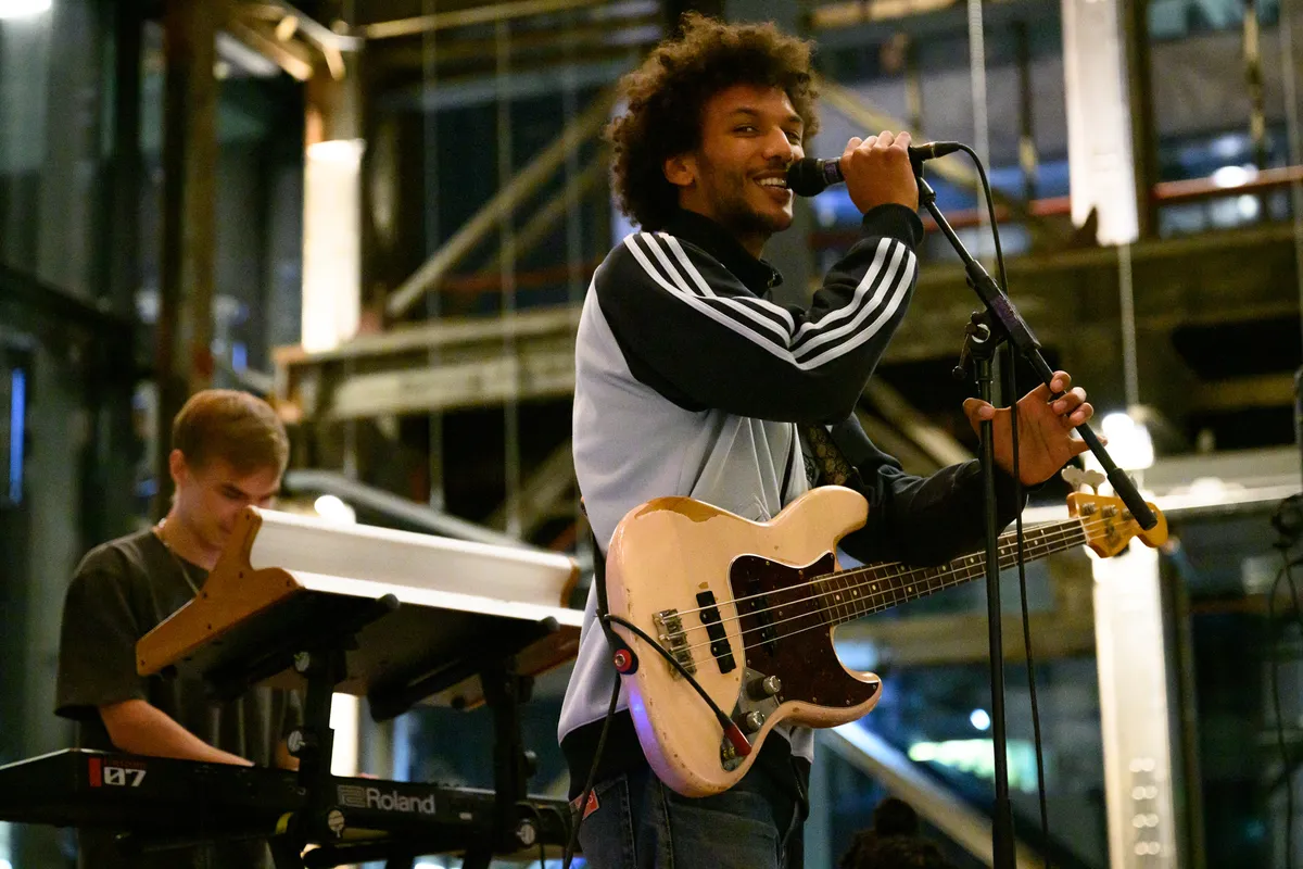 "Voor de mensen die aan het studeren zijn, het spijt me!", zo galmt het door de LocHal bij opener ANDRO. In de grote ruimte zit het publiek op de trappentribune (en komt er niet meer van af), maar voor ANDRO is dat geen probleem. De viermansband staat op het treinstel met overduidelijk plezier samen en grappen onder andere over de Volkswagen Polo waar ze in rond rijden. Met die grappen en een aanstekelijke mix van reggae, hiphop en pop kun je als publiek niet anders dan meelachen. Rotterdammer-met-Surinaamse-roots Andro Ackerman bracht afgelopen zomer zijn eerste EP uit waar hij vanavond met gepaste trots veel uit voordraagt. De sterke muzikale stukken, meesterlijk gitaarwerk en poëtische teksten vullen elkaar aan tot een rond geluid. Het is te merken dat het einde van de set in zicht komt wanneer het geluid af en toe wat slordiger wordt, maar er wacht ongetwijfeld nog veel groots aan de horizon voor ANDRO. (AK)