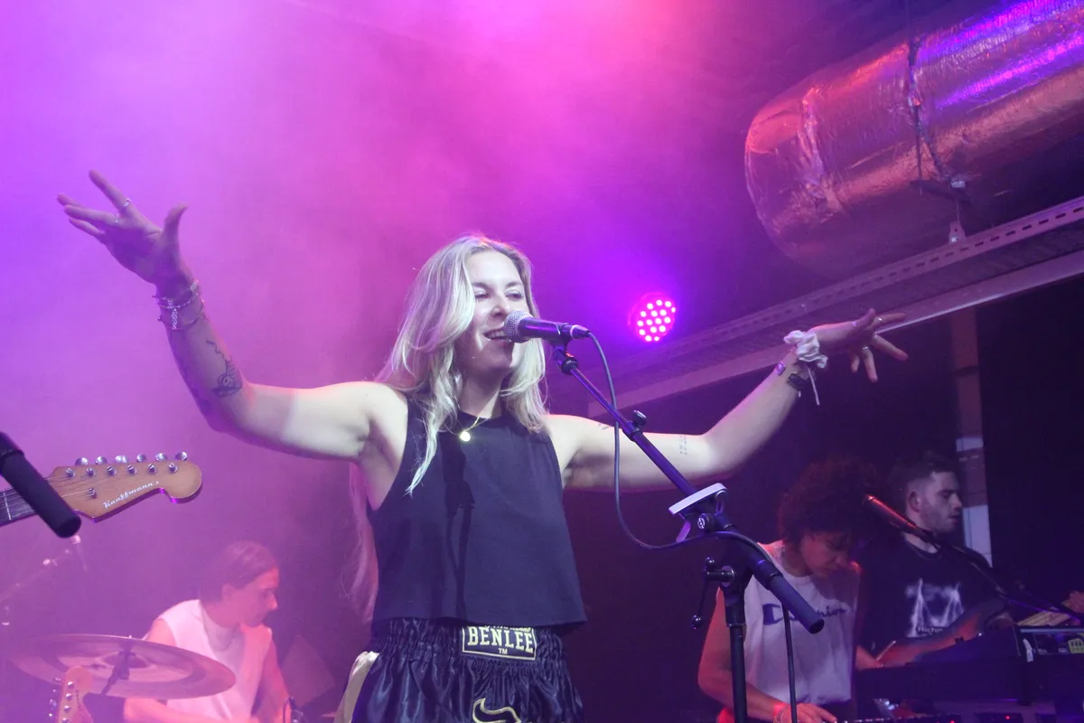 En dan is het zover: in boksbroekjes maakt HUNK haar entree op Hollaback Girl van Gwen Stefani. Het is duidelijk dat ze hier niet zijn om zich in te houden. Met een brede glimlach stuurt Joan (zangeres) een vloedgolf aan enthousiasme de zaal in. Het publiek reageert daar maar al te graag op. Dan is het tijd voor het eerste nummer genaamd Bug Me. Het is het startschot van een vurige set met een ondertoon van gevaar. Het is deze losbandigheid die de groep typeert. Waarom zouden ze zich beperken als ze zo mooi buiten de kaders kleuren?