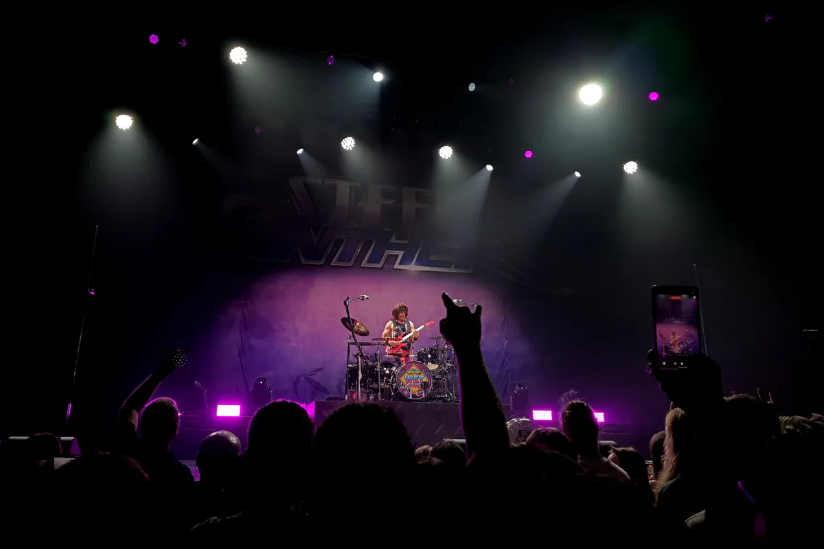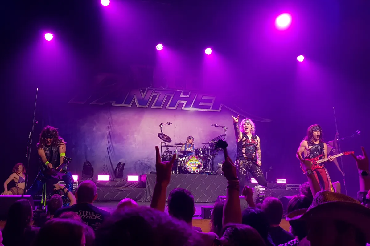 Steel Panther geeft een komische draai aan hairmetal-bands uit de jaren tachtig. Denk Mötley Crüe en Poison, hoewel we in de rustigere nummers en powerballads ook een dikke knipoog naar Bon Jovi ontdekken. Over-de-top teksten over feesten, rock-'n-roll en seks en passende spandex-kleding: dat zijn de ingrediënten voor vanavond. Spelen kunnen ze echter zeker wel: voor wie niet beter weet zou denken dat hier een authentieke metalband staat. Met ‘Eyes of a Panther‘ en ‘It Won't Suck Itself‘ als aftrap staan de versterkers al meteen standje hard, aangevuld met supersnelle gitaarsolo's, straffe drums en hoge uithalen in de zang. Satchel demonstreert later in de set zijn gitaar-kunnen in een uitgebreide solo (daarbij zichzelf begeleidend op drums) waarin we onder meer flarden van Ain't Talkin' 'bout Love van Van Halen en Sweet Child o' Mine van Guns N' Roses herkennen.