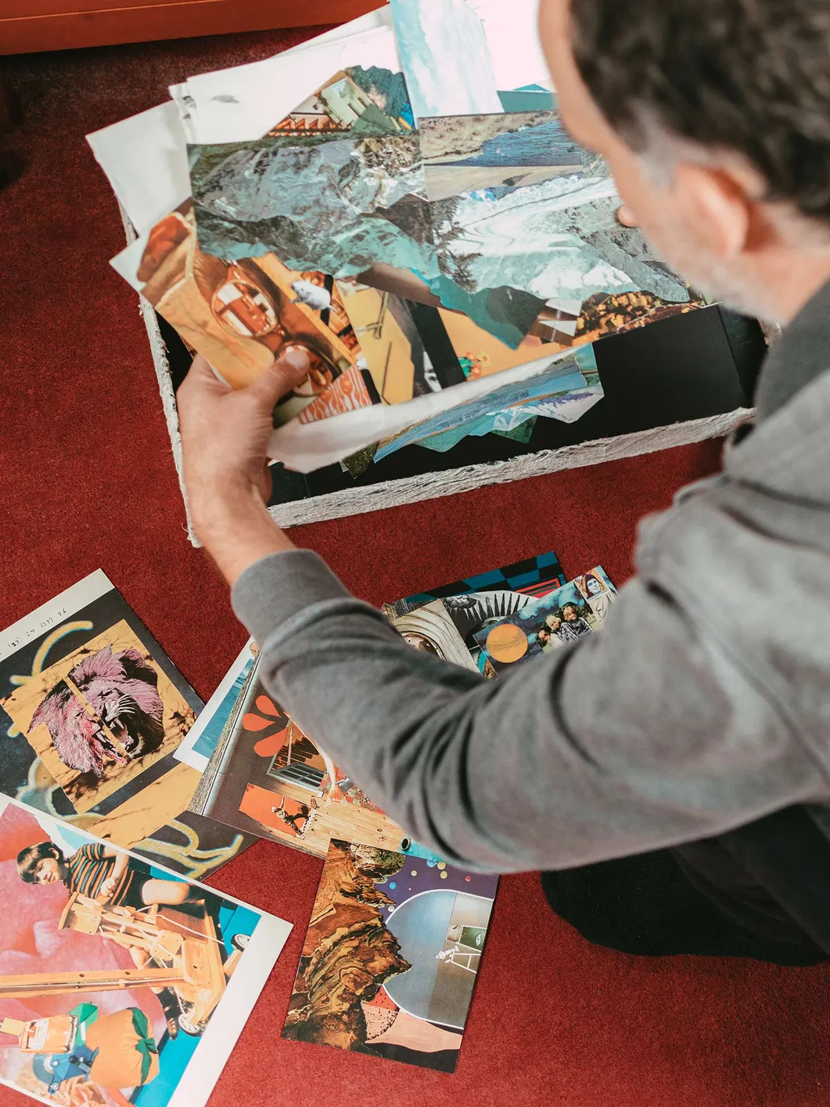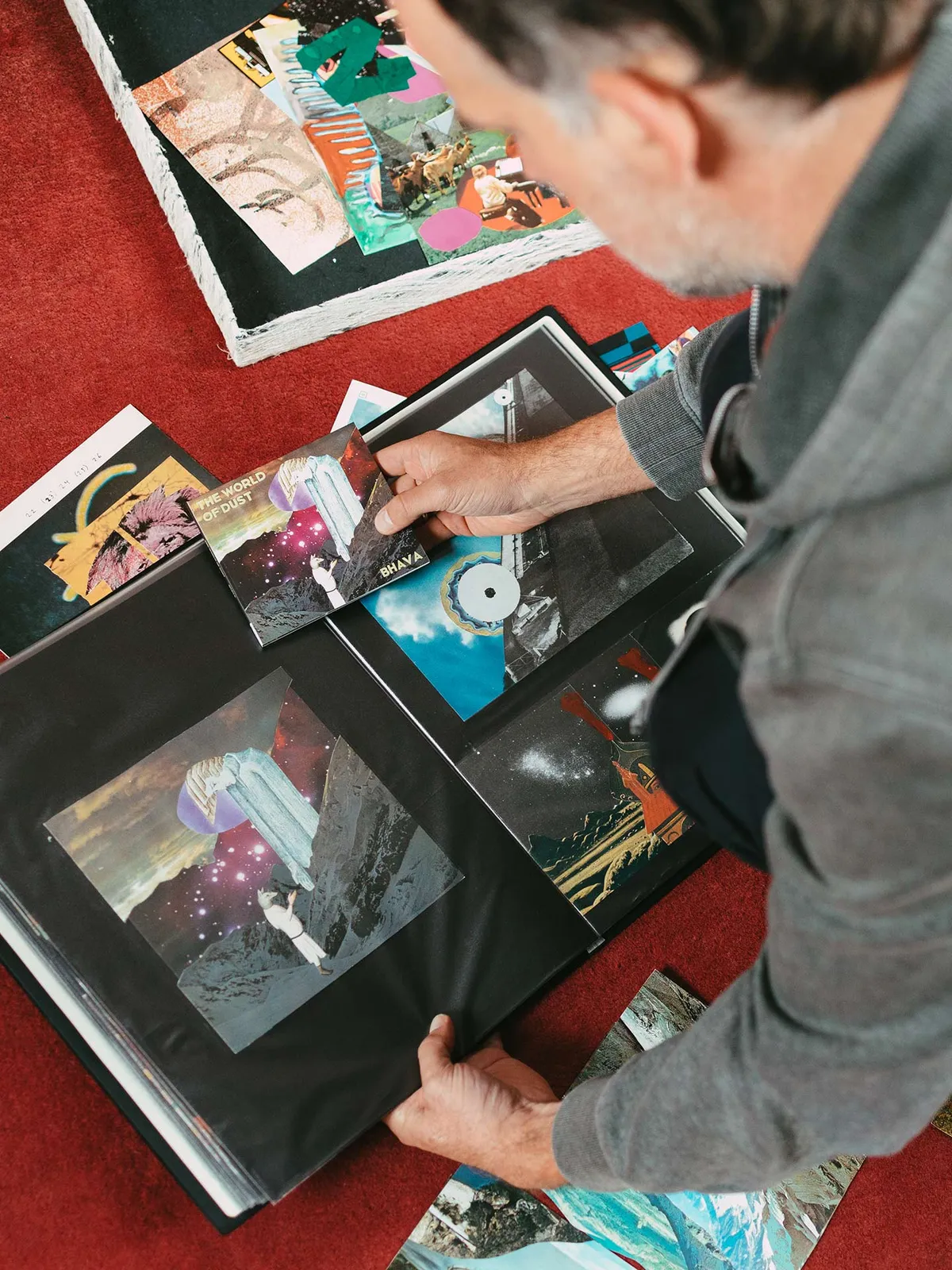 Voor sommige eerdere platen hanteerde Breuer een thematische aanpak voor de covercollage, meestal is het vooral vanuit gevoel en sfeer: “De kleur moet helemaal kloppen voor een cover, dat moet aansluiten bij de kleur die ik zie als ik naar de muziek luister. Hoe heet als je kleuren hoort?” Synesthesie dus. Voor Breuer betekent dit dat een hoes of collage soms beïnvloedt hoe hij de muziek hoort, of andersom dat de muziek invloed heeft op de collages die hij maakt: “Bij True Sounds, mijn vorige plaat, had ik het idee dat de muziek heel blauw klonk, maar de cover was er eerder, dus het kan best dat die collage de muziek heeft gekleurd. Bij mijn nieuwe akoestische plaat, Gaman, had ik een seventies-oranje gevoel.” De collages die hij niet voor The World of Dust gebruikt belanden niet in de prullenbak, deze gebruikt hij bijvoorbeeld weer als concertposters met daaroverheen veel tekst.