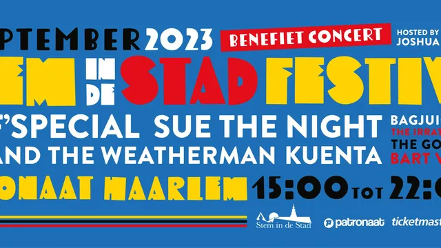 De Haarlemse organisatie en ontmoetingsplek Stem in de Stad organiseert op zondag 10 september 2023 een benefietconcert in Patronaat. Tussen 15.00 en 22.00 uur zijn er optredens van eveneens Haarlemse artiesten als Chef'Special, Sue The Night, Jack & The Weatherman, The Irrational Library en meer. De avond heeft als doel om Haarlemmers en met name jonge Haarlemmers er bewust van te maken dat er ook stadgenoten zijn die het minder makkelijk hebben. Alle opbrengsten van het benefietconcert gaan naar Stichting Stem in de Stad. De kaartverkoop start vandaag om 11:00 uur via Patronaat Haarlem.
