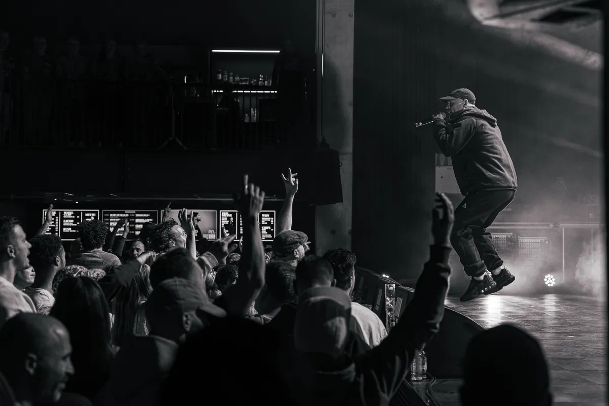 De route naar de chaos begint bij Dookie, die de avond mag openen in zijn hometown. Aanvankelijk houdt het publiek nog wat afstand, maar nadat Dookie het twee keer vriendelijk heeft gevraagd, schuift de zaal massaal naar voren. En terecht: bijna nonchalant stapelt de Heerlenaar zijn teksten op rauwe beats, met een vanzelfsprekendheid die verraadt dat hij al jaren meedraait. Mooi moment wanneer hij een jong talent, Gideon, het podium op trekt en ruimte geeft voor een eigen nummer. Zo wordt duidelijk: Dookie heeft oog voor nieuw talent, maar verdient zelf minstens even hard een plek in de spotlights. Dat er voor een lokaal voorprogramma is gekozen, voelt dan ook meer dan logisch – Limburg barst van het hiphoptalent.