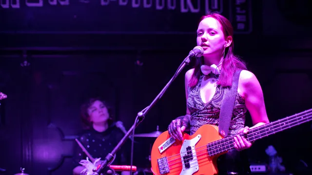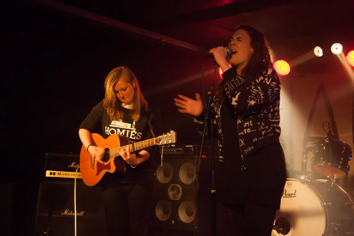Vrouwelijk gekreun vult de gedeelde woonkamer van een studentenhuis ergens aan de Telefoonstraat. Was niet iedereen ingelicht dat Stukafest vanavond is? Geen nood; het maakt allemaal onderdeel uit van de act van drietal Clittenband, bestaande uit zussen Aya en Noortje Dupont voor het gitaarwerk en Hannah Schuur op drums en huis-tuin-en-keukenspullen. Liedjes over onbeantwoorde verlangens hebben naar onder andere leraren en Thierry Baudet, worden op kleinkunstige manier gewikkeld in muzikale snoepjes die zoet beginnen en oh zo zuur eindigen. Clittenband verleidt je, maar op je gemak voelen is uit den boze, zoals bij het rauwe Overtreed Me (met de heerlijke zinsnede ‘Als blikken konden pijpen, was iedereen al klaar’) dat in een semi-akoestische setting nog veel dreigender klinkt dan op plaat. Tegelijkertijd is er iets engelachtigs aan de meerstemmige momenten, waarbij alle drie de muzikanten elkaar feilloos aanvoelen en zijn de enige twee verwijten dat de zang van Noortje soms nog wel eens wordt overstemd door de basdrum en dat met dertig minuten de meesten hier nog liever wat langer hadden willen genieten van de afterglow. (BvD)