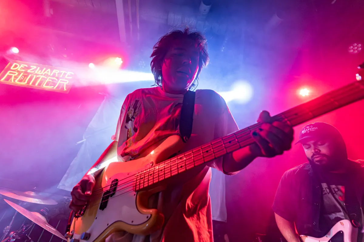 Gezeten in overall kondigt de drummer van TAXITAXI zijn medebandleden aan, die vanaf de mezzanine trap het podium van De Zwarte Ruiter op rennen: als waren ze prijsvechters in Mexico. Maar dan in overalls die sterke jaren ‘70-garage vibes oproepen. Het enige wat nog ontbreekt aan het plaatje is een Pirelli-poster met halfblote dames. Daarmee is niet gezegd dat deze mannen een macho patriarchale show neerleggen. Alles lijkt tongue-in-cheek zonder dat je echt weet wat nou wel gemeend is. TAXITAXI kan ons meer dan bekoren. Wij houden wel van ironie. Iedereen die ooit een ‘teamleider’ heeft gehad, herkent zich in het gelijknamige nummer. De agressie die het oproept jegens de ‘invoelende en begrijpende’ teamleider, kan lekker weg gebeukt worden in de mishoor. Want, TAXITAXI is een soort mix van onze Røyking, Wodan Boys en durden. Oh, met net dat vleugje extra rap-ironie van Bitterzoet. De bas doet hier niets dan strakke riffs neerleggen waar gitaar en drum op los kunnen. Recht zo die gaat. Als een olietanker met de snelheid van een speedboot komt TAXITAXI op je af. Als het tempo even omlaag gaat, voel je het pompende geluid van de boegschroef. Dit trio heeft heel goed door hoe je in deze tijden van AI het echtste bent als je een parodie bent van alles, en dus jezelf.