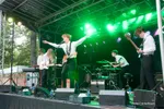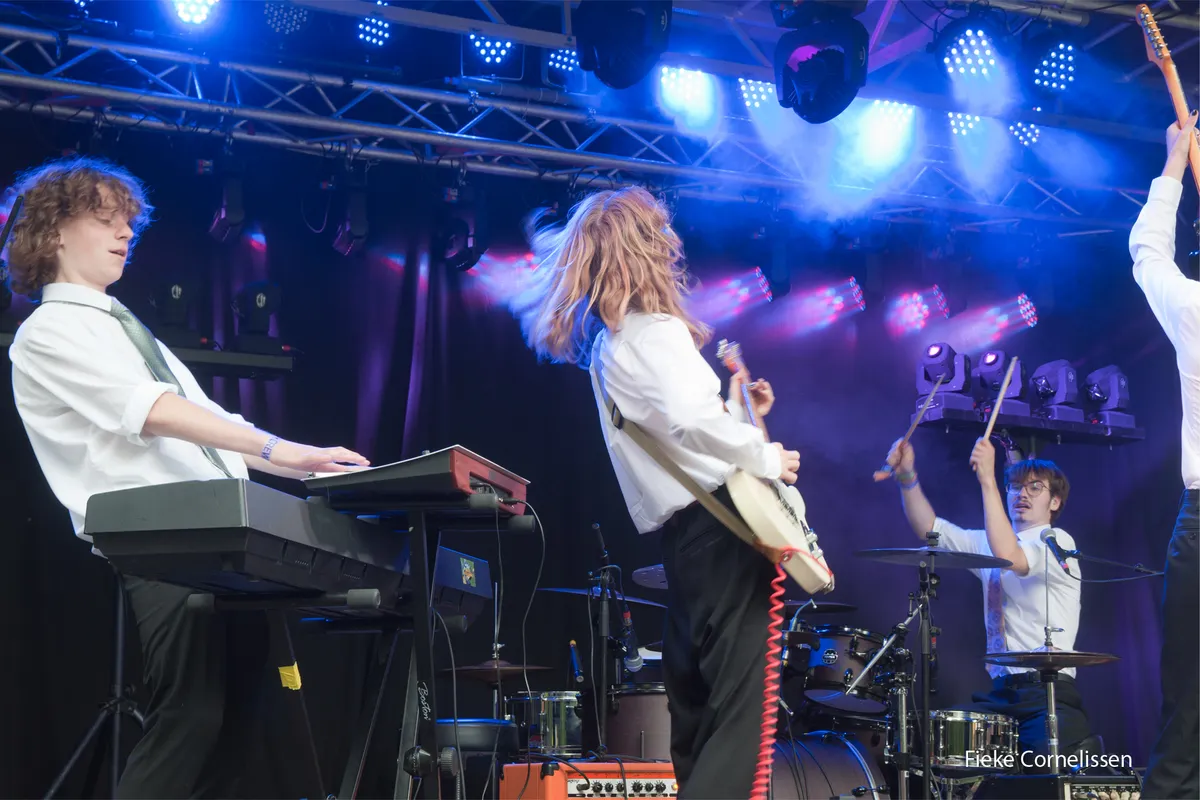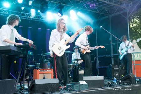 Met hun witte bloesjes en hun aantal nemen de vijf jongens van Grote Geelstaart veel ruimte in beslag op de Future Stage. Het is een volle bezetting, zowel op als voor het podium. Ze hebben niet één, maar zelfs -af en toe- twee drummers die tegenover elkaar zorgen voor snelle ritmes. Met daarbij drie gitaren, toetsen en zang brengt Grote Geelstaart veel geluid op het relatief kleine podium. Gierende synthesizers en punk nummers vloeien door de speakers en laten zien dat deze band anders is dan de anderen. Gekke gilletjes en geschreeuw door de microfoon maken ook plek voor geheel instrumentale, maar harde en snelle nummers. Aan het optreden is geen touw vast te knopen en dat is nou net wat de Grote Geelstaart uniek maakt. (FC)
