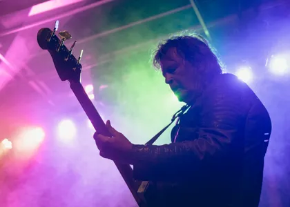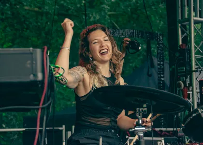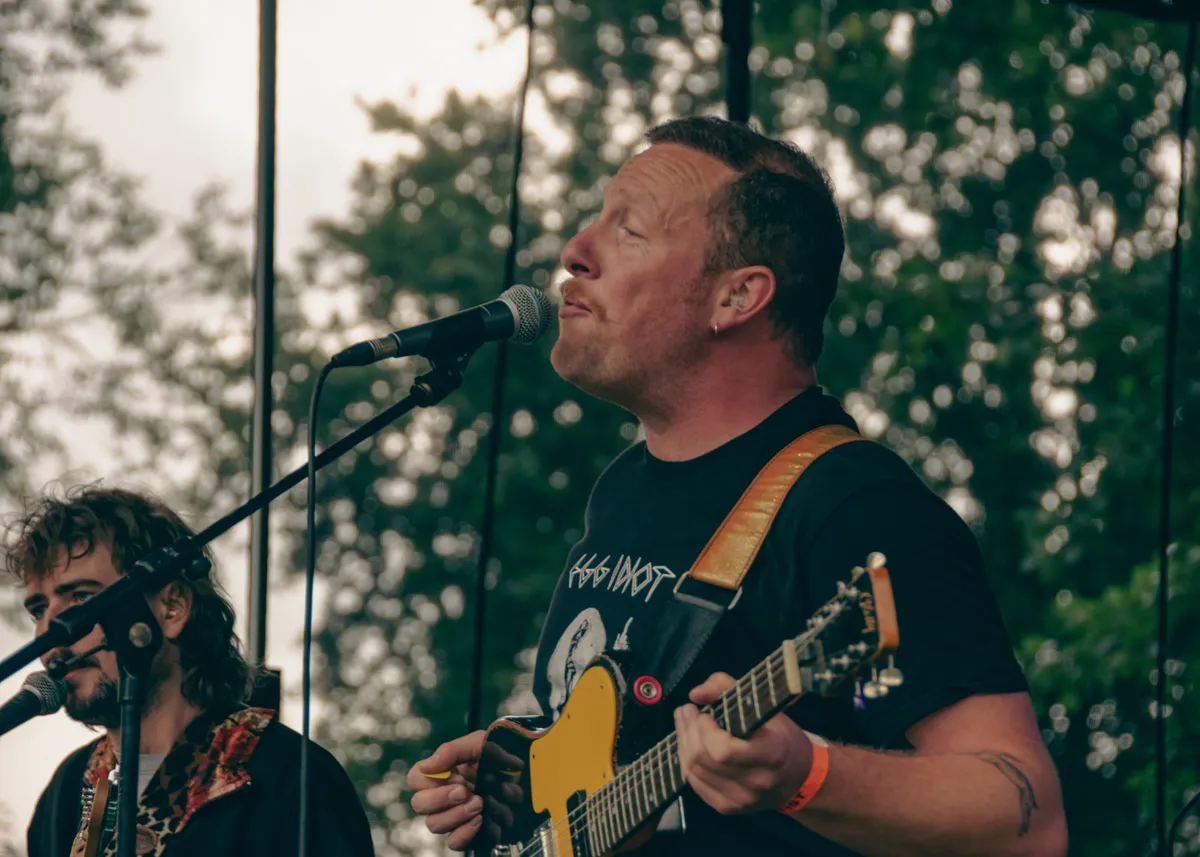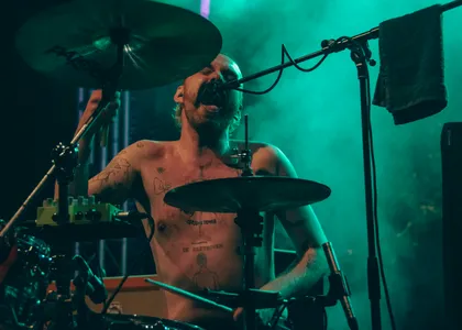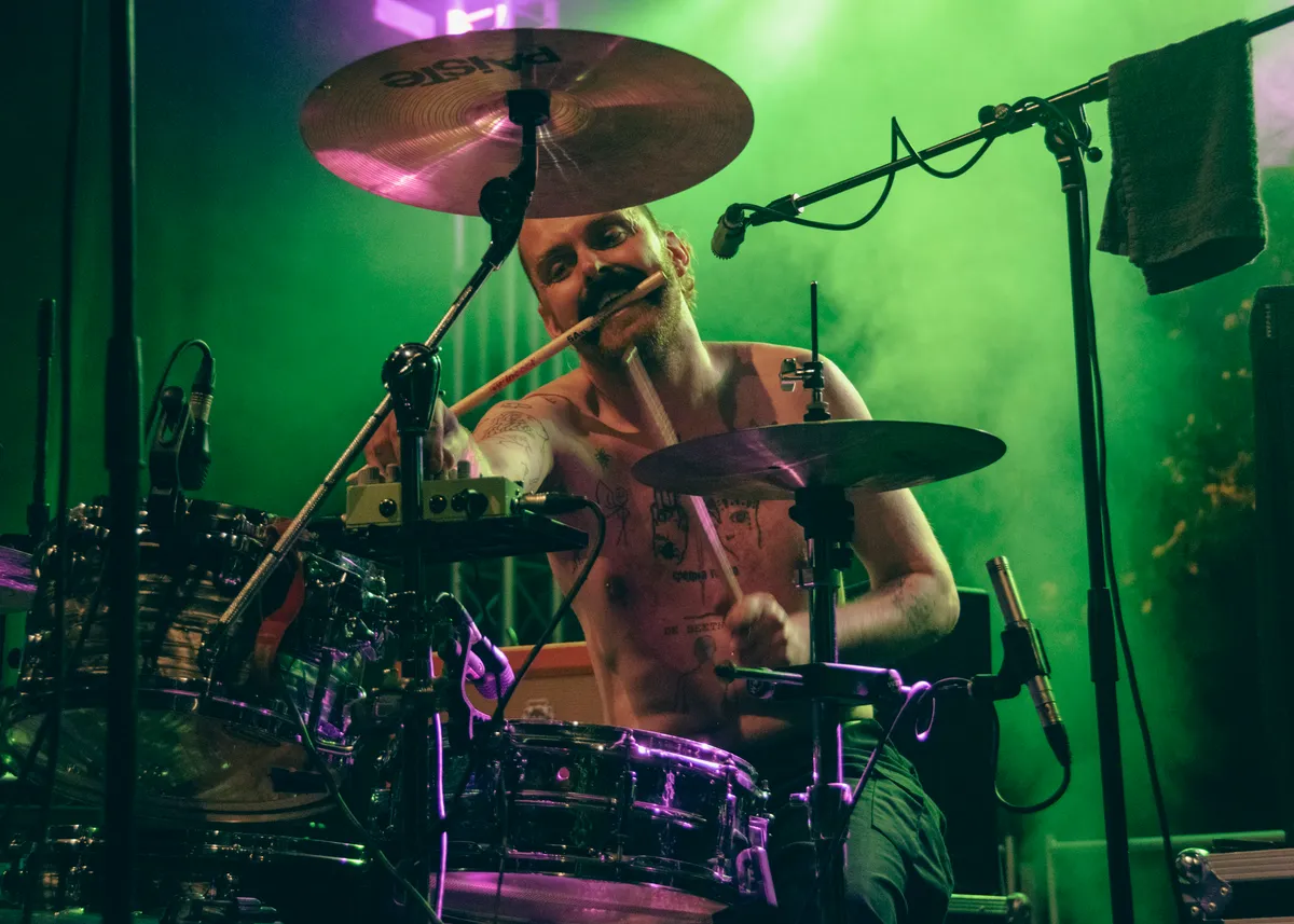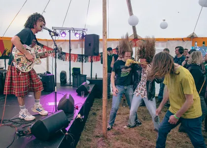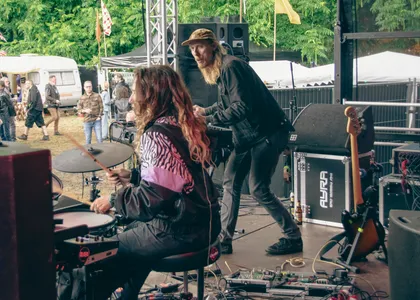 Iguana Death Cult’s succes reikt over landsgrenzen, de band heeft veel meer dan alleen succes in Nederland. Straks staan ze in Roemenië (of all places), en in oktober touren ze door de Verenigde Staten. Vandaag is de reis wat korter. Iguana Death Cult is uit Rotterdam vertrokken naar het festival in Hoorn. Het lijkt erop dat de line-up van Grondslag zo is ingevuld dat er steeds meer scheurende gitaren en beukende bassdrum in de muziek zitten. Tijdens het optreden van Iguana Death Cult trillen de versterkers van de knallende bas. Toch is de muziek speels, er wordt een beatring beslagen en de samababal geschud. Er komt zelfs een trombone aan te pas. Lead-man Thomas seint eventjes te gaan moshen. Misschien niet het beste idee met de gladde modderpoel die is aangericht door de stortvloed, maar met lachende smoelen wordt zijn bevel opgevolgd.