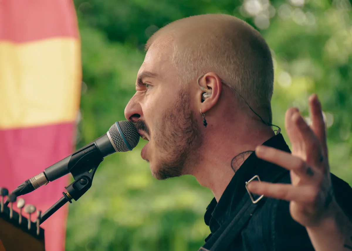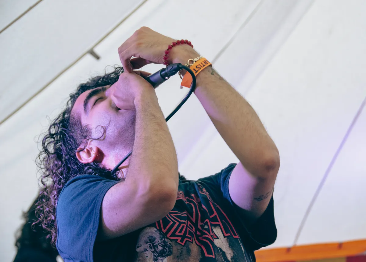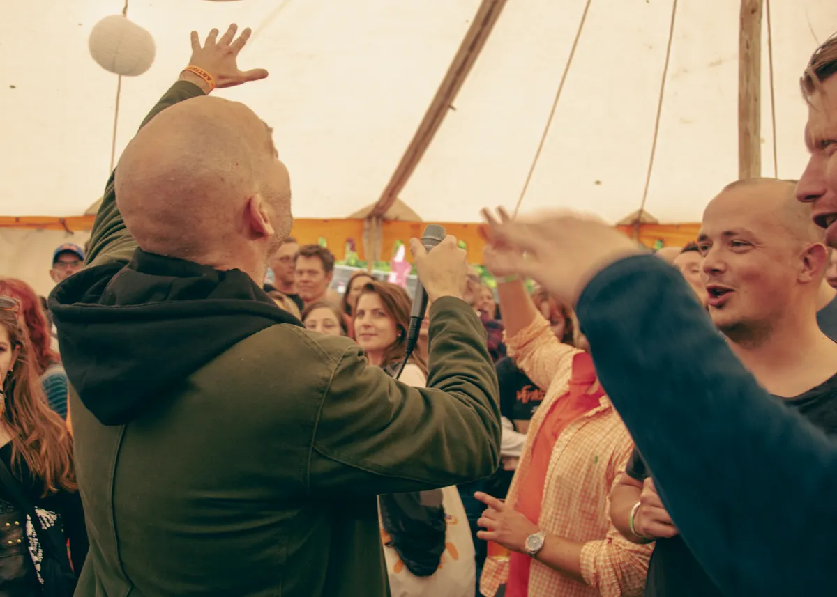 Tijdens het optreden van Thames op het grote podium begint het te regenen. Een deel woestelingen blijft doorstampen in de grond die verslapt is tot modder, maar sommigen besluiten te schuilen in de tent. Hier begint een moment later het optreden van Engel & Just, alsof het zo gacalculeerd is. Engel & Just maken Nederlandse rap en hebben samengewerkt met onder anderen Paul de Munnik, Diggy Dex en Tim Knol. Engel begon in de jaren 90 rappen, en de rapstijl van dit tijdperk is terug te horen in de nummers. Vandaag kon wederhelft Just er helaas niet bij zijn, maar Engel vindt het festival in zijn thuishaven te belangrijk om af te zeggen. Vandaag is het dus niet Engel & Just, maar just Engel. De plek van Just wordt ingevuld door Stephan Wolven, die al de hele dag tussen optredens door een ruig plaatje draait (en ook nog eens de foto’s van dit artikel schiet!). Engel bemant het podium toch met zelfvertrouwen, en zingt “ik hoef geen medelijden, ook al sta ik in mijn eentje”. Hij sleept de tent mee met zijn ode aan Hoorn.